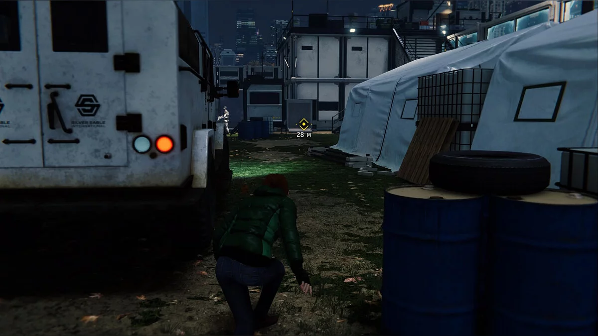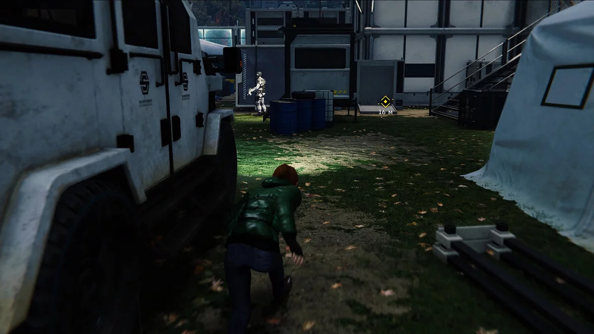Переключаемся на Майлза и крадемся мимо заключенных. Обходим осколки стекла. Взламываем экран или прожектор и уходим с парковки.