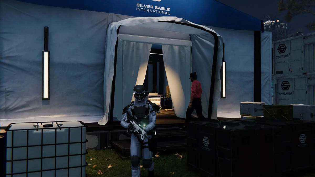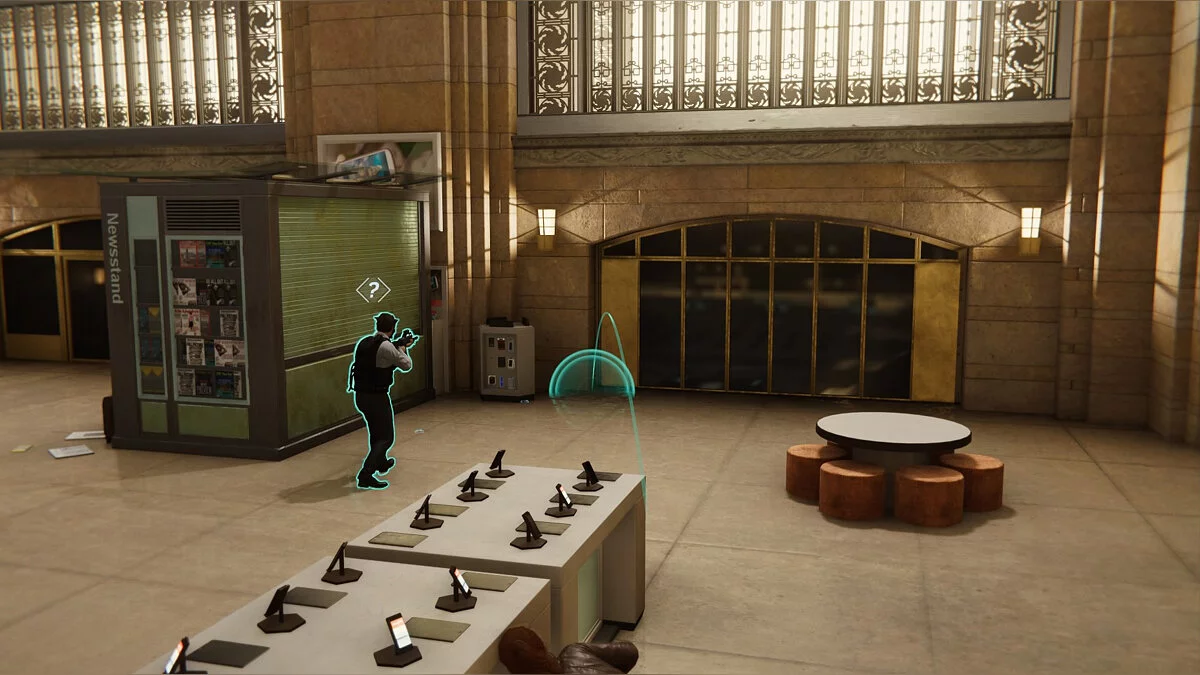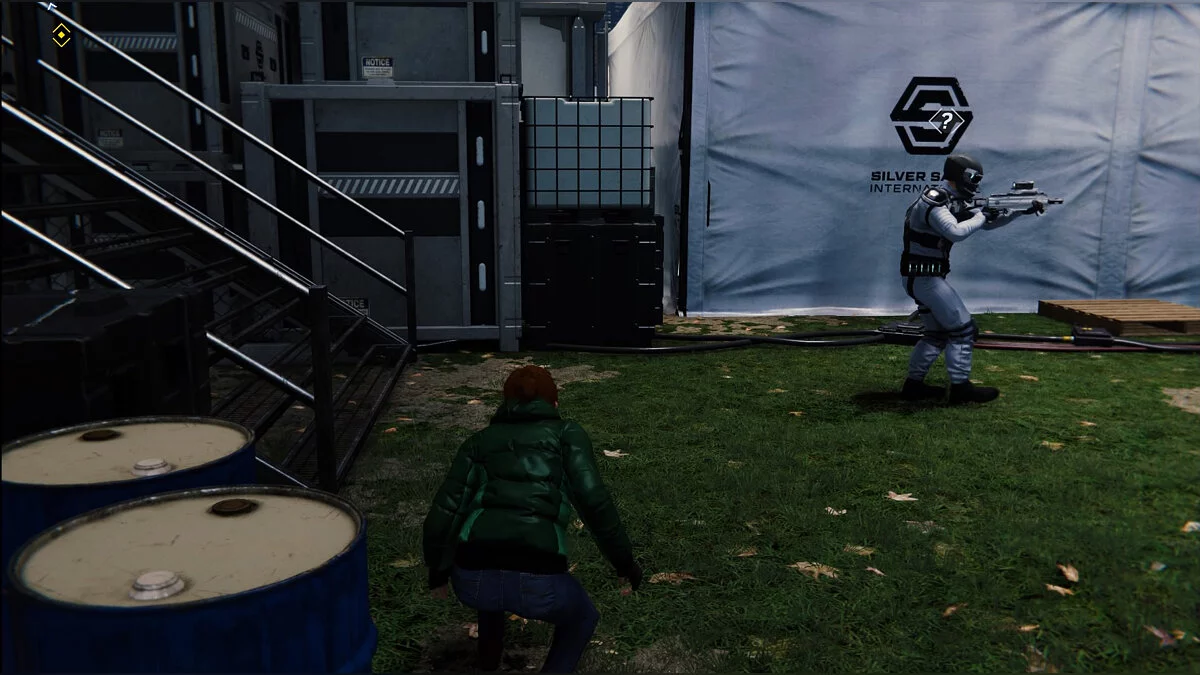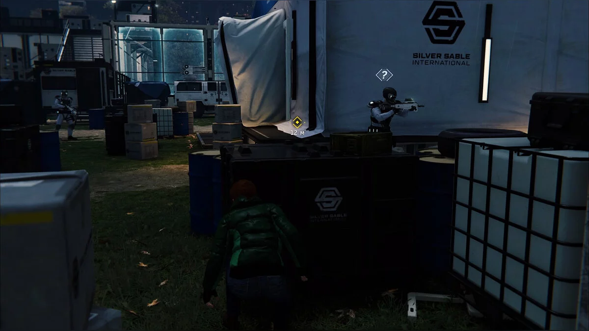 Нам нужно пробраться на балкон. Двигаемся вдоль левой стены. Проходим за первым охранником и отвлекаем других, около входа в кладовую. Дальше лучше идти на балкон. Доходим до ванной комнаты и отвлекаем врага. Остается охранник перед точкой «эвакуации».