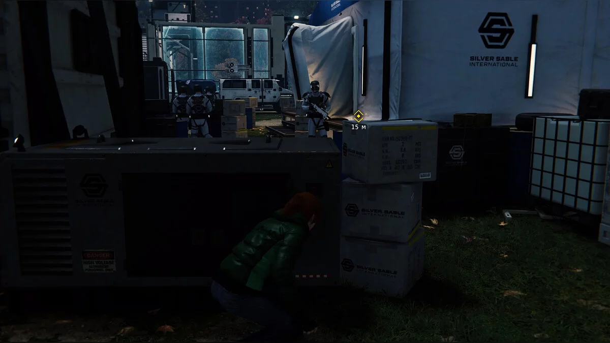 Взламываем погрузчик и пробегаем весь двор. Проходим контейнер и прячемся. Взламываем радио, чтобы Носорог сломал коробки. Вот и свободен выход с уровня.