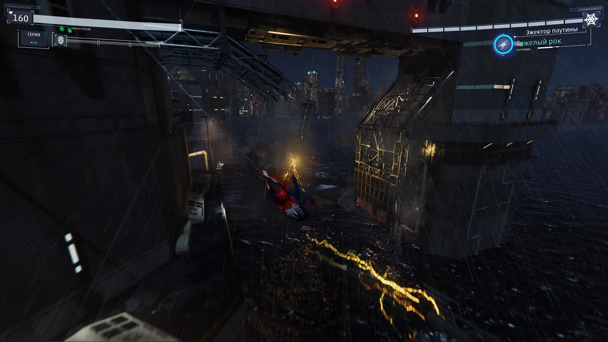 Попадаем на электростанцию, где сперва придется отбиваться от Электро. В основном он будет зависать в воздухе и стрелять электричеством. Стреляем в него паутиной после его атак. Нажимаем «треугольник» и наносим ему несколько ударов.