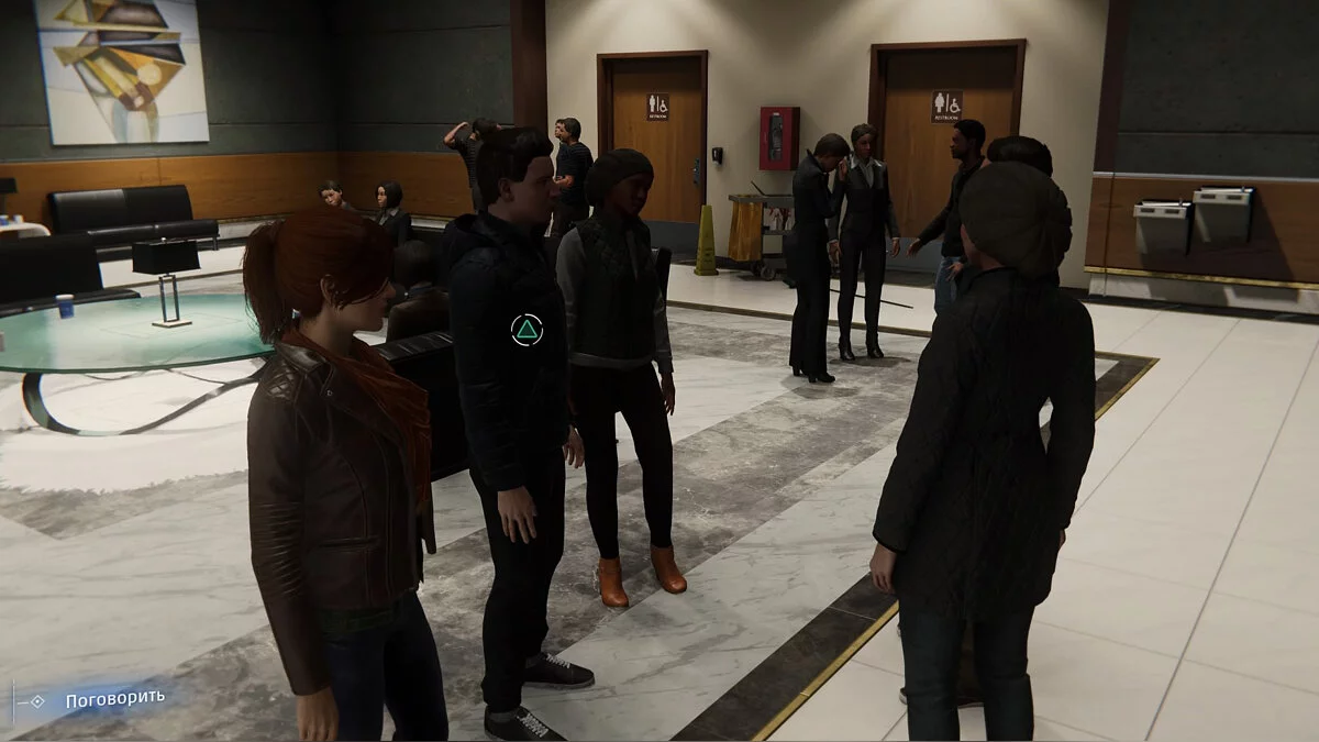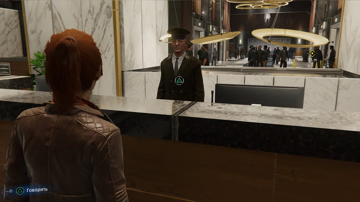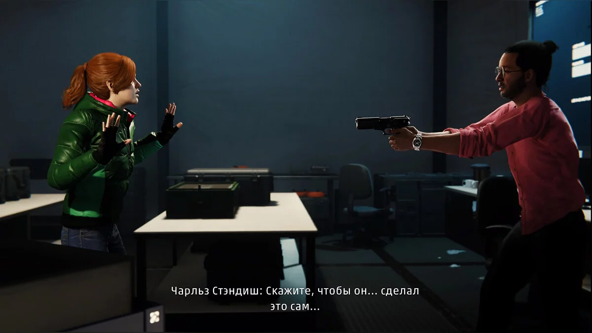 Мэри Джейн пытается пробраться в башню Озборна, чтобы узнать про секретную лабораторию. Чтобы попасть в комнату охраны нужно отвлечь их от двери. Говорим с тремя людьми, чтобы они начали шуметь.