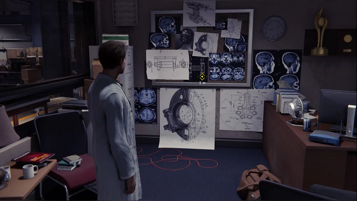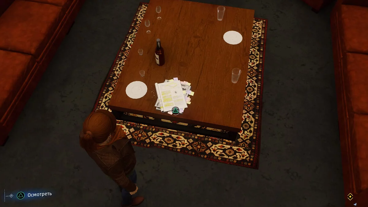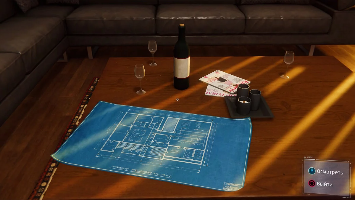В пентхаусе Осборна очень много интерактивных предметов, можно не спеша осмотреть все. Главное — это маска на столе. С ее помощью находим потайную дверь. Подтверждение наличия тайной комнаты можно найти на чертежах рядом.