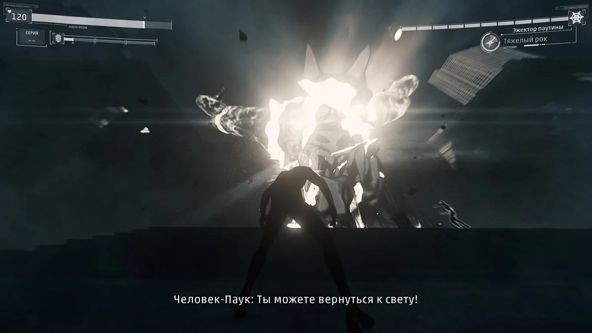 Фиска же сперва оглушаем, а затем бьем. Для этого используем предметы окружения. Используем паутину в нужные моменты. После нанесения ударов отступаем от босса. Он атакует довольно быстро и агрессивно. Попадаем в другой зал, повторив несколько раз удары по боссу.