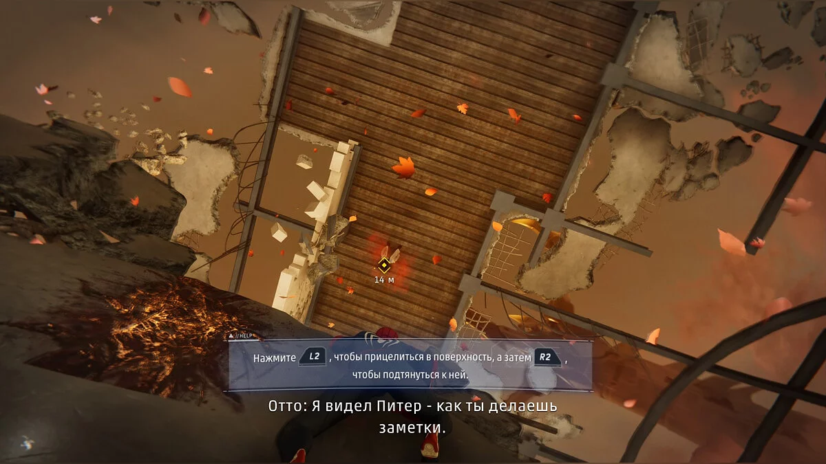 На следующем этапе боя Отто заберется на макушку башни и будет бросаться мусором, а пол загорится. Можно передвигаться на паутине или прыгать по фонарям. Бросаем в него мусор и жмем «треугольник». Снова повторяем удары из первой фазы, пока он не заберется на башню.