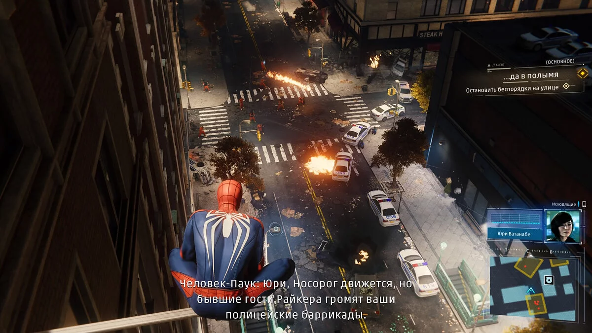 Теперь и наемники Соболя охотятся на Человека-Паука. Юри сообщит, что Электро и Носорог громят отделения полиции. Не важно к какому злодею отправиться сперва. Отправляемся к одному из них, передвигаться придется быстро, так как почти на всех крышах будут враги с огнестрельным оружием.