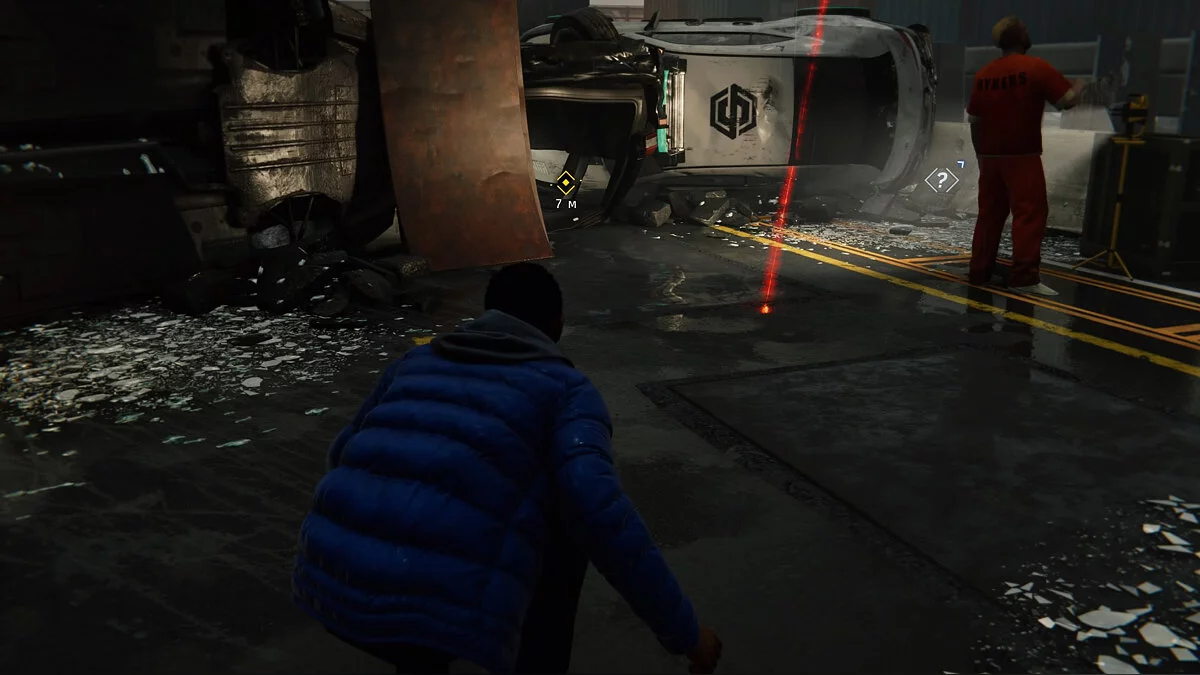 Учимся бросать противников друг в друга, используя клавишу «треугольник». Натыкаемся на противников с огнестрельным оружием, на них можно обрушить куски потолка. Идем дальше и помогаем людям разобраться с завалами.