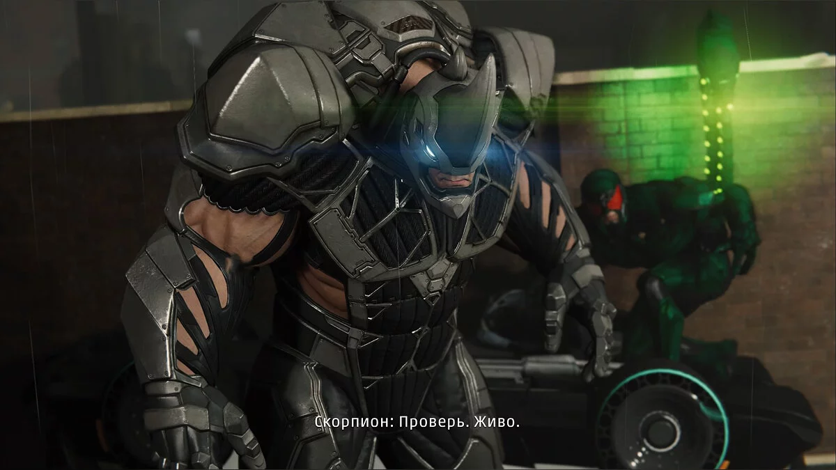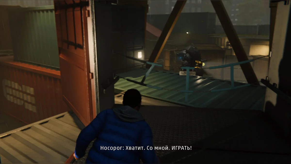 Поднимаемся по лестнице и пытаемся от крыть дверь. Тут и начнут появляться остальные «друзья» Паука. Сперва встречаем Носорога, а чуть дальше — Скорпиона.