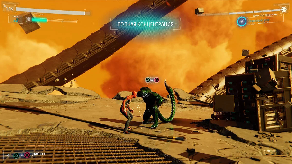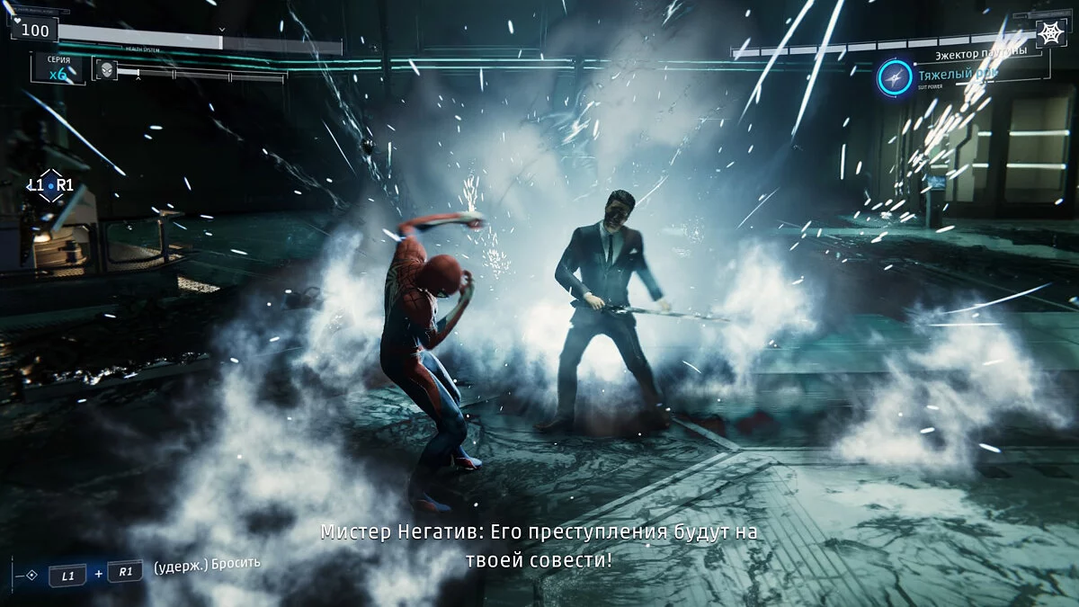 На заключительном этапе нам придется противостоять сразу двум противникам. Атакуем того, кто попадается под руку и ломаем трансформатор. В итоге начнется кат-сцена, в которой придется быстро отбросить во врага кусок трубы. Уворачиваемся от Стервятника, нажав «круг». Победив парочку злодеев Паук немного отдохнет.