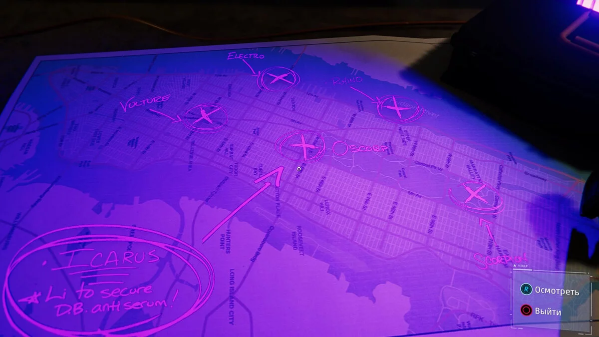 В конце осматриваем карту города. Включаем ультрафиолетовую лампу и выключаем свет. Щиток находится над столом Стервятника. Осматриваем карту и все отметки на ней.