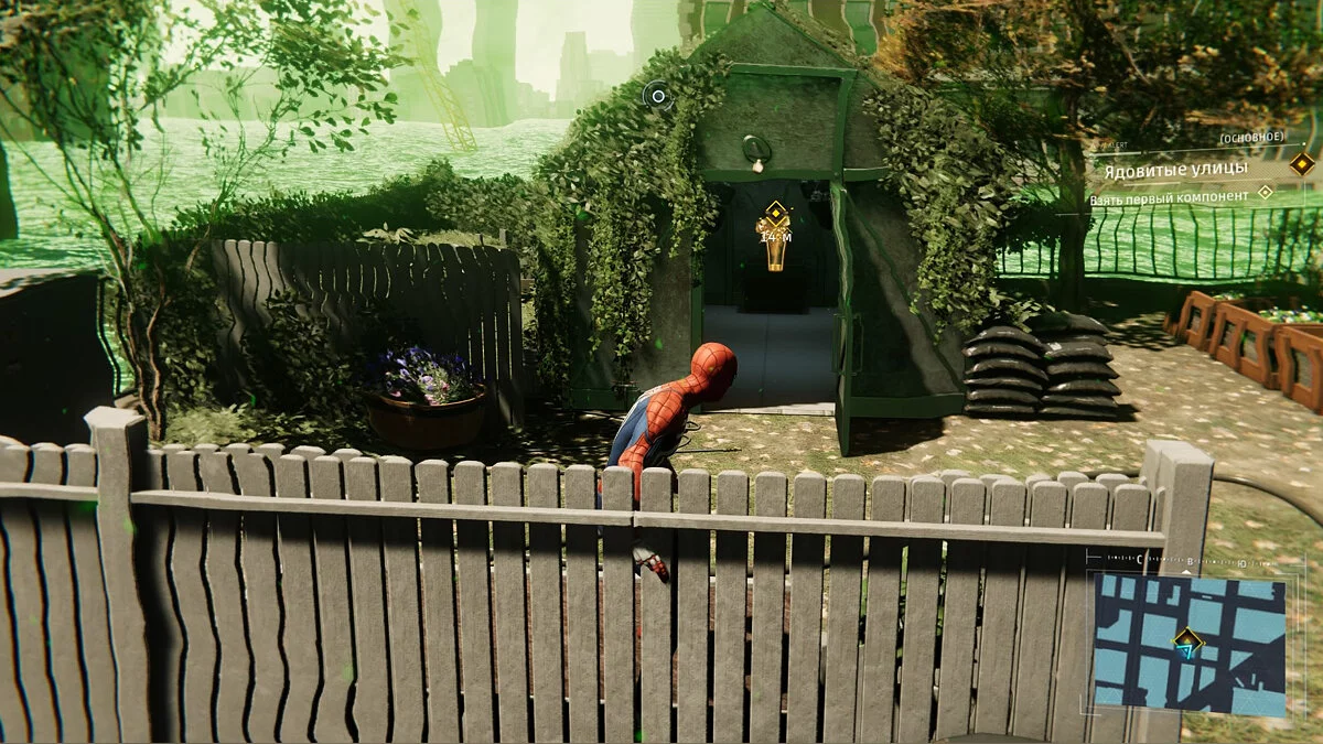 Отправляемся за первым компонентом противоядия в оранжерею местного университета. Касаться яда внизу нельзя, поэтому постоянно держимся в воздухе или на зданиях.