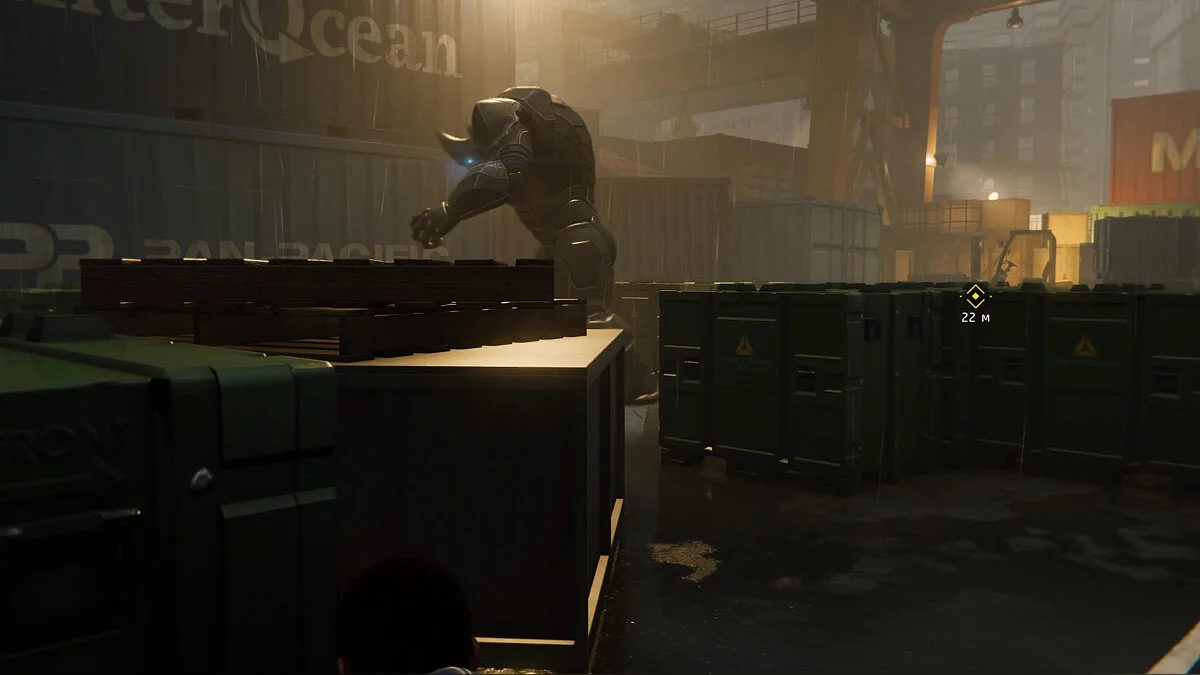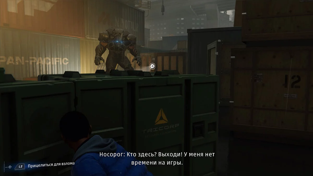 Выходим и забираемся на деревянные ящики. Далее просто перебегаем от укрытия к укрытию и не попадаемся на глаза Носорога. Но не прячемся за деревянные ящики, он их ломает.