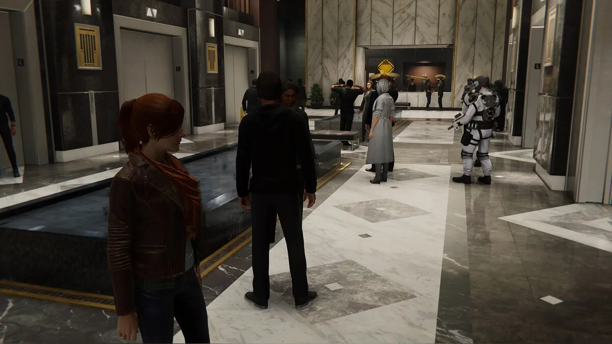 В кабинете охраны будет еще один враг. Включаем тревогу и идем обратно к лифтам. Заскакиваем в лифт, когда Осборн и охрана отвернутся.