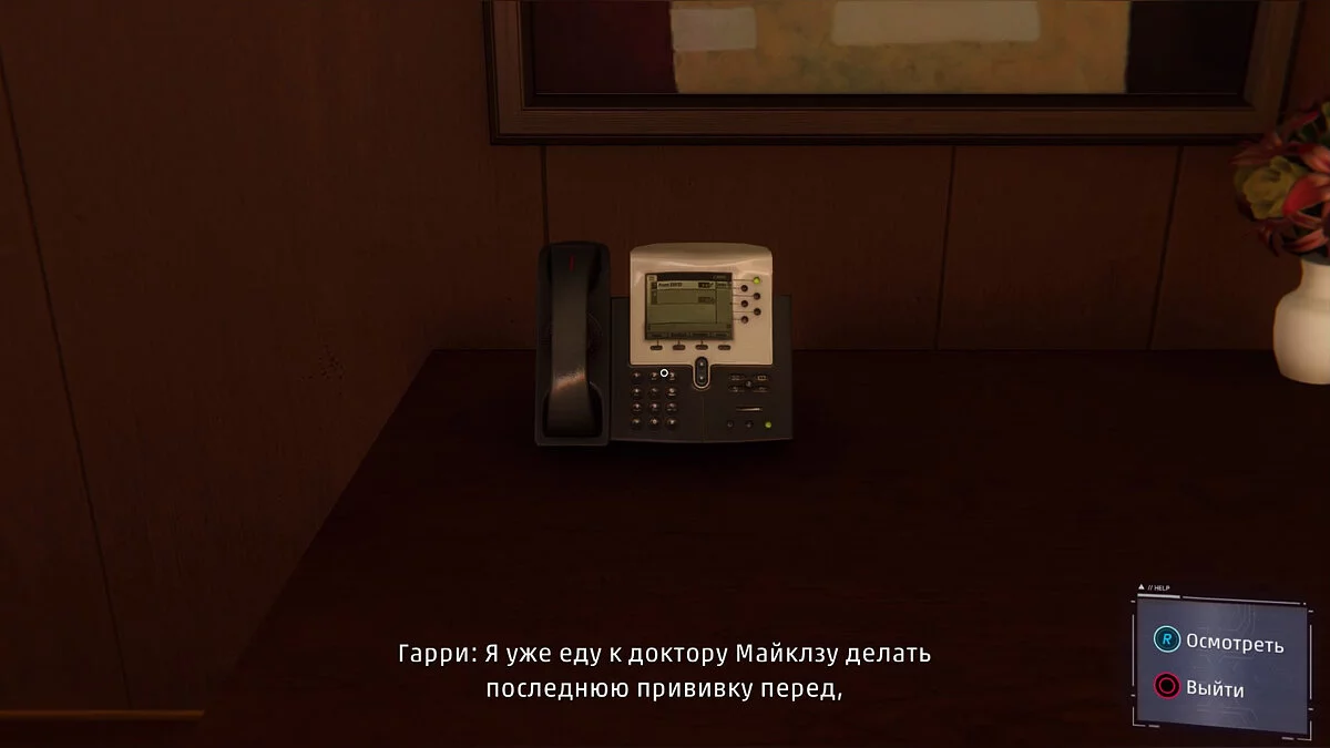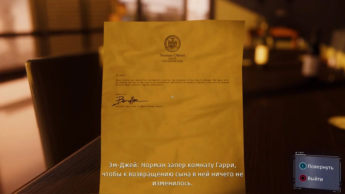 В спальне на обратной стороне фотографии находим ключ. Заходим в спальню Гарри и читаем дневник. Дочитываем дневник и в пентхаусе появляется охрана.