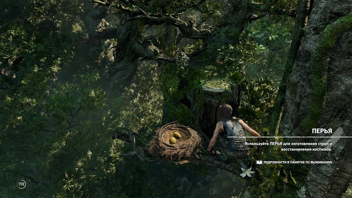 Тут будет лагерь и вход в саму гробницу. Спускаемся со скалы, раскачиваясь на веревке. Прыгаем назад и находим выход. Прыгаем вперед на ветки. В ответвлении слева собираем ресурсы и дневник путешественника «Совсем рядом». Тут же раскапываем тайник выживальщика.