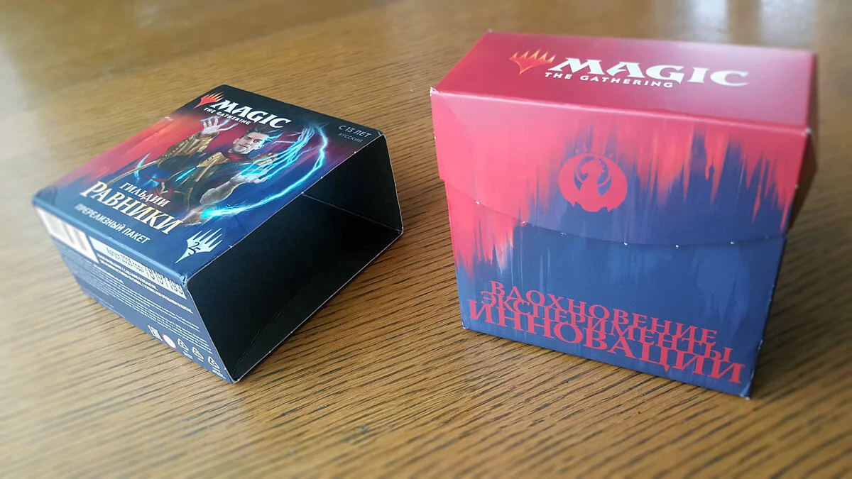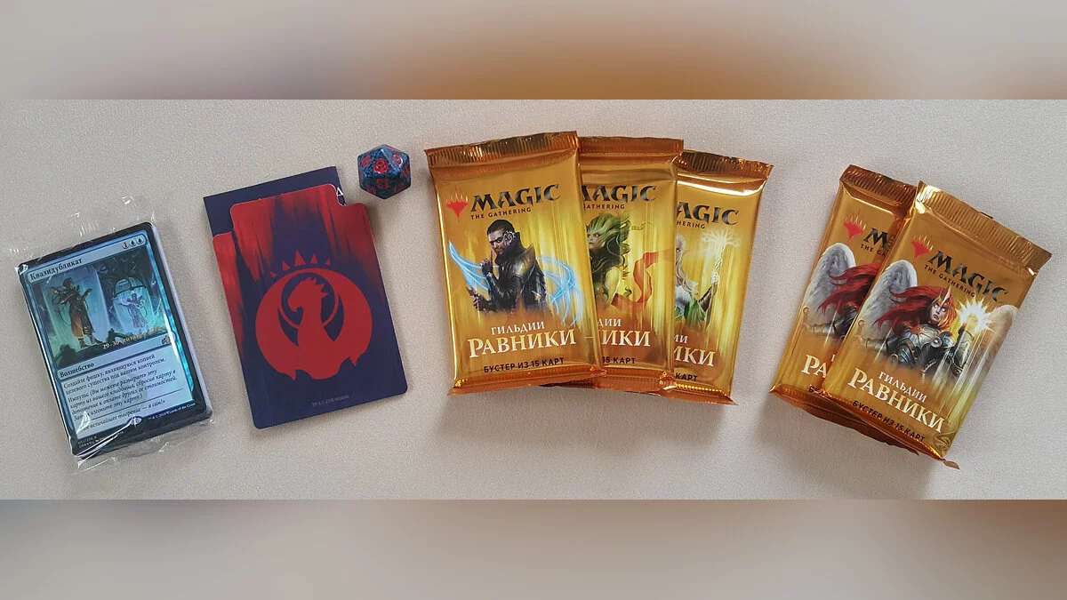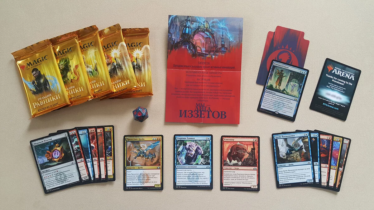 Чем они отличаются? Вместо одного из бустеров в коробке лежит пакет с картами, гарантированно принадлежащими той или иной гильдии. В нашей случае это карточки Иззетов — группировки, использующей красный и синий цвета магии. А вот полный состав пререлизного набора «Гильдий Равники»: