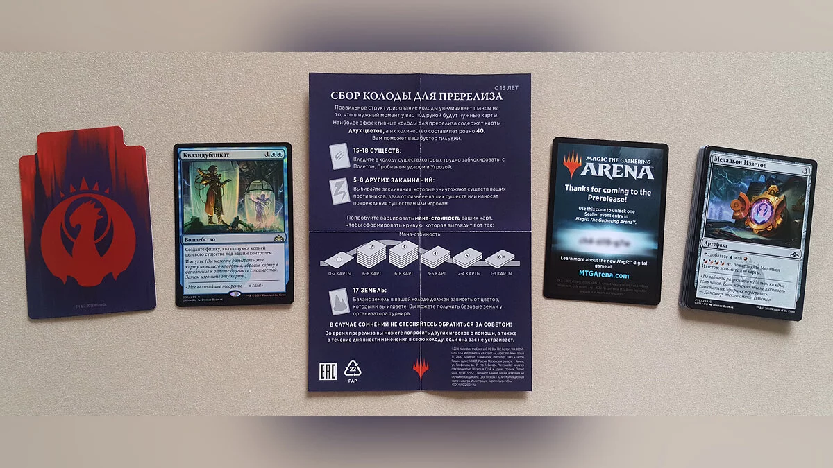 Но если в одном из бустеров выпала очень хорошая карта другого цвета, то можно добавить и ее, главное не забыть доложить соответствующих земель. Еще одна важная деталь — это соотношение карт разных типов. На пререлизе играют колодами по 40 карт, а значит земель в них должно быть меньше, чем обычно. Соотношение существ и других заклинаний можно увидеть на памятке из набора.