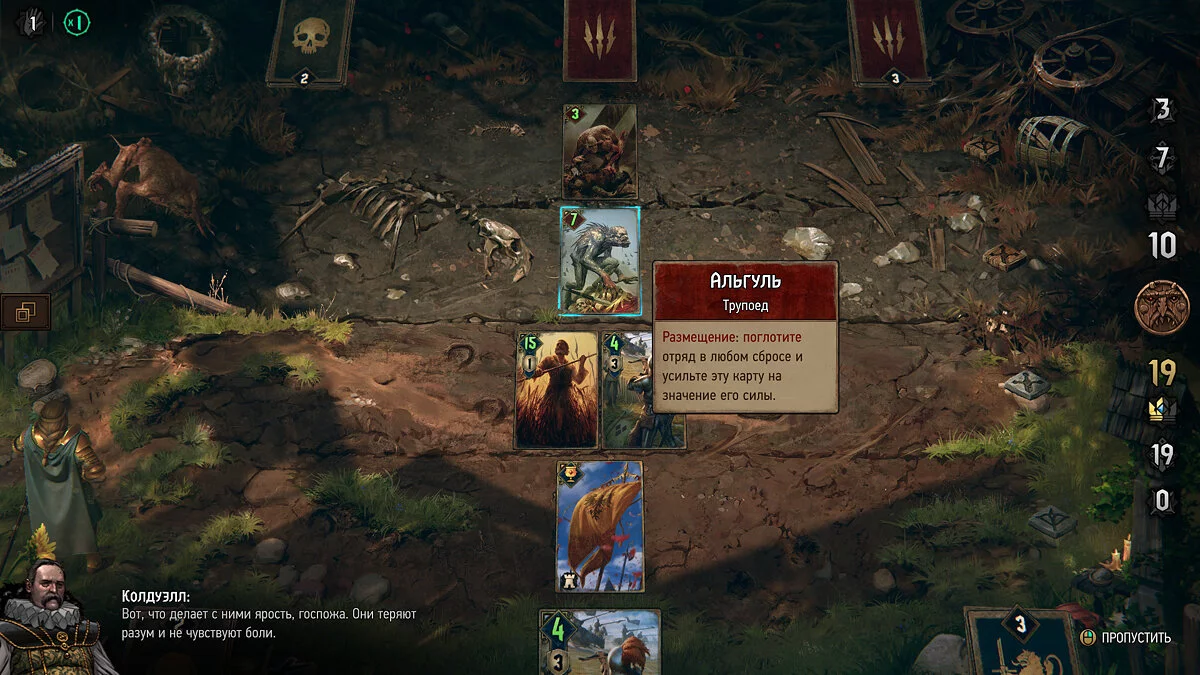 Боевая система в «Кровной вражде» целиком и полностью представлена обновленной механикой «Гвинта». Это правильное и логичное решение — использовать уже отработанную стратегическую модель, чтобы разнообразить основной геймплей. Помимо ресурсов и интерактивных сцен на глобальной карте можно найти множество самых разных противников.