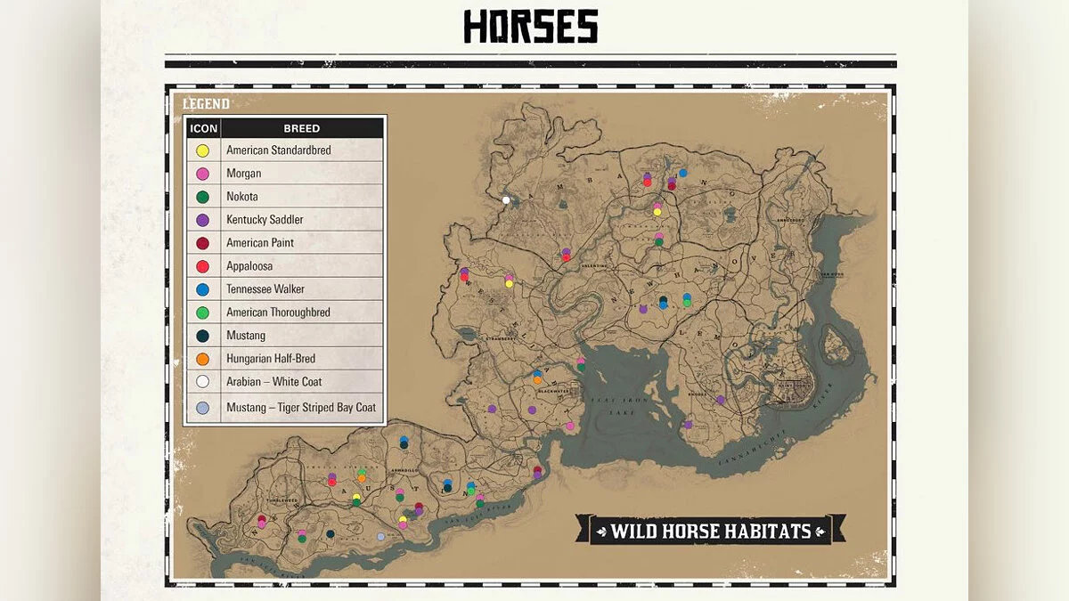 В игре вы можете не только купить лошадь, но и найти ее на просторах Дикого Запада. На карте отмечены локации, где можно встретить скакуна той или иной породы.