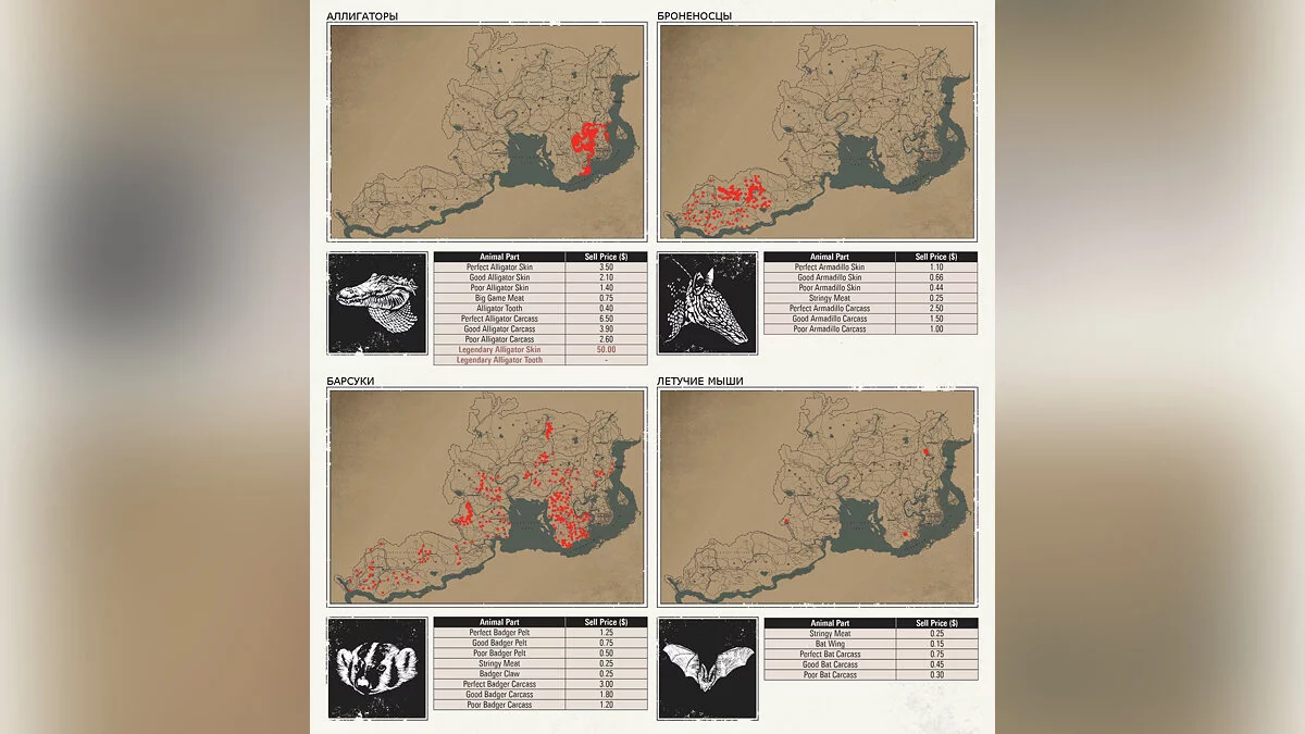 Теперь пришло время карт — на следующих картинках вы можете видеть ареалы обитания всех животных RDR 2 и конкретную информацию о том, сколько стоят (sell price) их части (animal parts). Не забывайте о качестве частей — чем они лучше или крупнее, тем больше денег вы получите. Много долларов (40-50 за 1 часть) можно заработать, если принести часть легендарного животного. Как на них охотиться, читайте в специальном гайде.