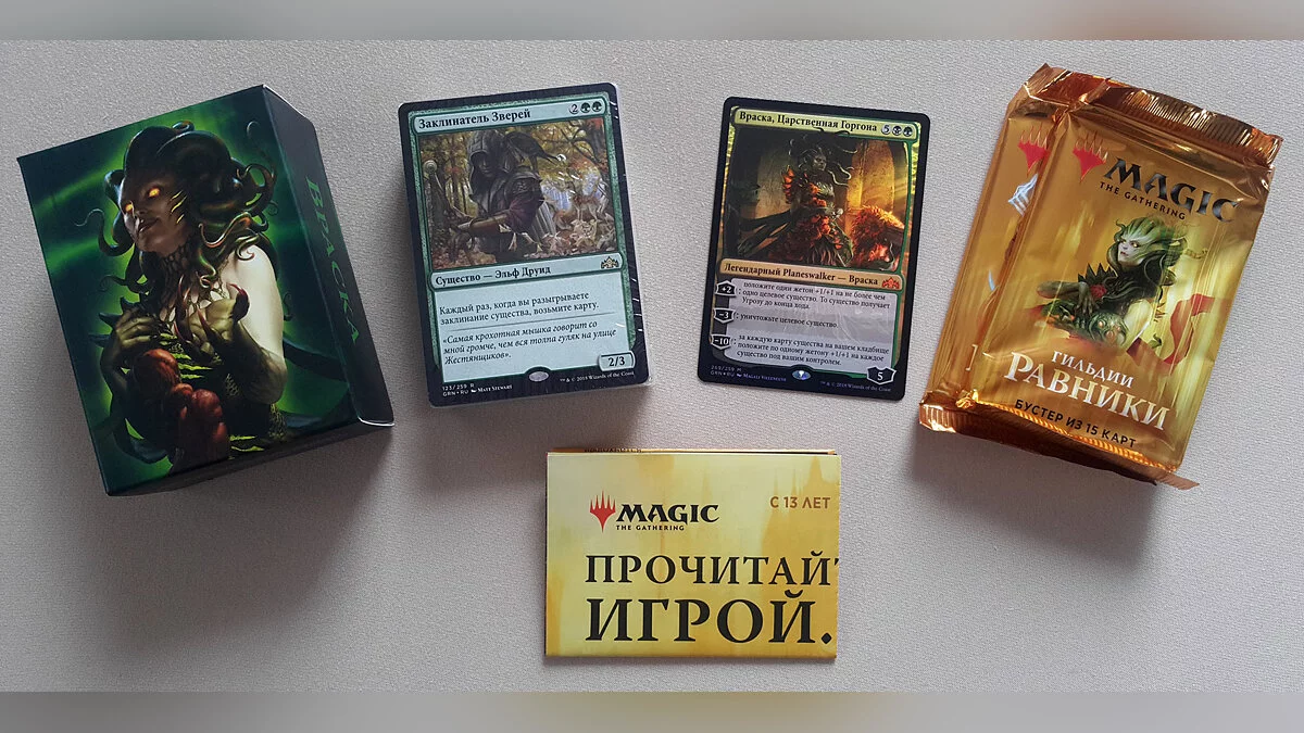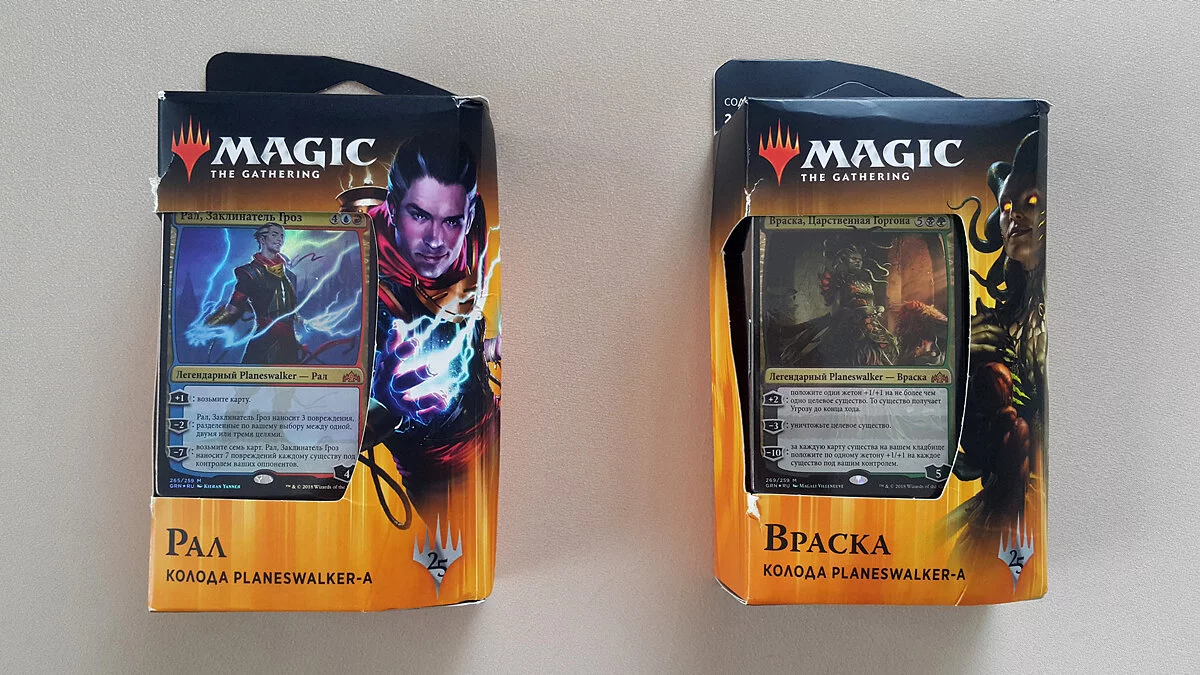 С выходом «Гильдий Равники» наборы Planeswalker-ов претерпели сразу 3 изменения. Во-первых, в комплекте с колодой вновь поставляется 2 бустера. Напомним, что в «Базовом выпуске 2019» был только один. Бустеры — это такие пакетики с 15 случайными картами, среди которых есть 10 обычных карт (common), 3 необычных (uncommon) и одна редкая (rare) или даже мифическая (mythic).