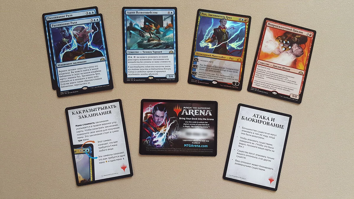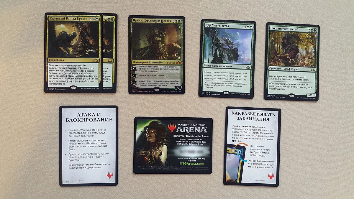 Во-вторых, в дополнение к брошюре с правилами игры разработчики решили положить в набор 2 карточки-памятки с кратким объяснением основных механик: как разыгрывать заклинания и как проводить сражения. В-третьих, в наборе есть ключ активации, с помощью которого можно получить цифровую версию колоды в Magic: The Gathering Arena.