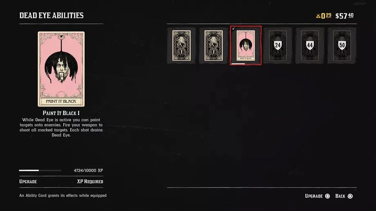 Первый слот, который будет доступен, предназначен для умения «Меткий глаз». Позже вы откроете слоты для карт с пассивными способностями — такие карты работают постоянно. В Red Dead Online «Меткий глаз» не замедляет время. При его использовании вы получаете бонус, в зависимости от установленной пассивной карты: