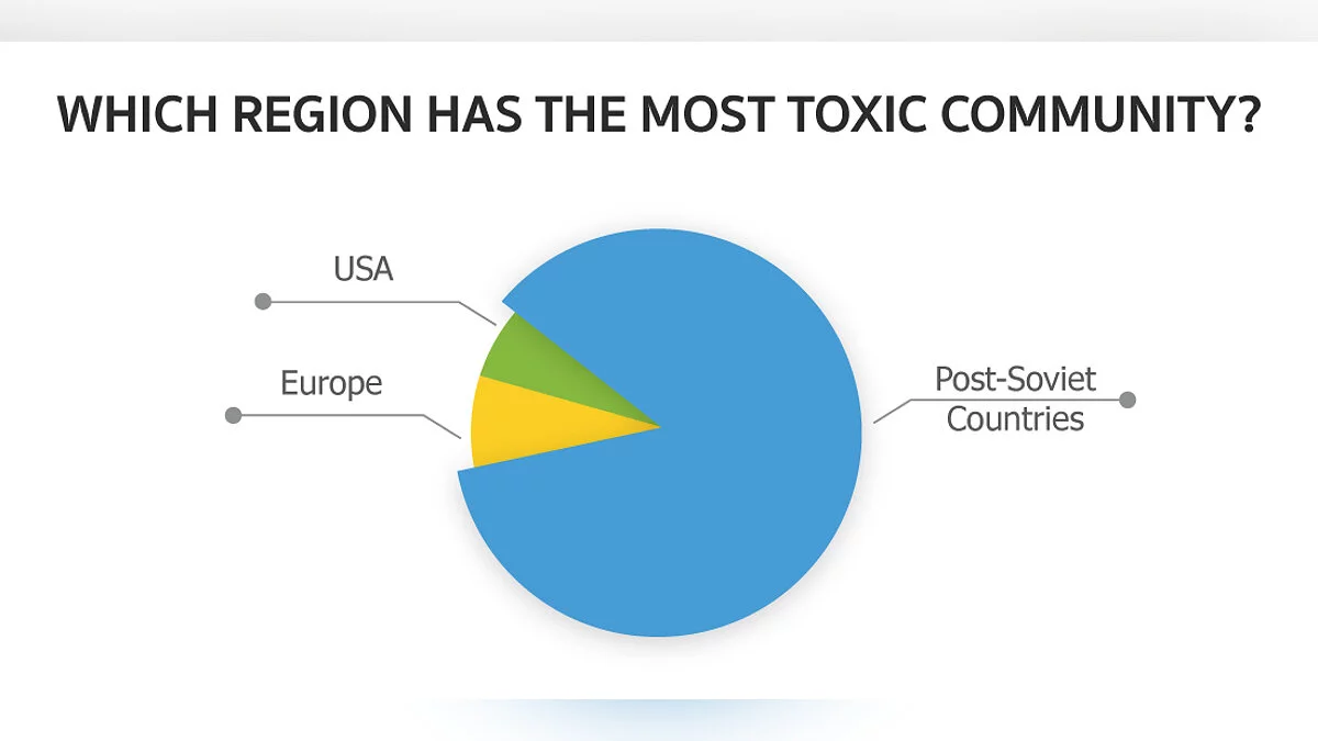 А вот на Западе люди ведут себя вежливее и пару лет назад они впервые столкнулись с таким размахом токсичности. Опросив 2 566 геймеров из Восточной Европы, портал GameTree выяснил: «86% респондентов считают, что постсоветские страны являются источником самых токсичных геймеров».