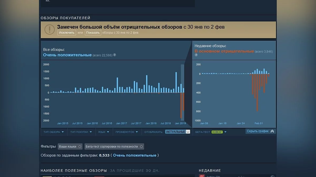А через какое-то время волна отрицательных отзывов добралась до предыдущих игр серии Metro всё в том же Steam. В период с 29 января по 3 февраля количество отрицательных обзоров у Metro 2033 Redux и Metro: Last Light Redux увеличилось в 2 раза. И на момент написания статьи они составляли 19.4% и 18.8% от общего числа обзоров соответственно. Однако, о тотальном обрушении рейтингов говорить не приходится, ибо это резкое увеличение составило только около 9 процентов для обеих игр.
