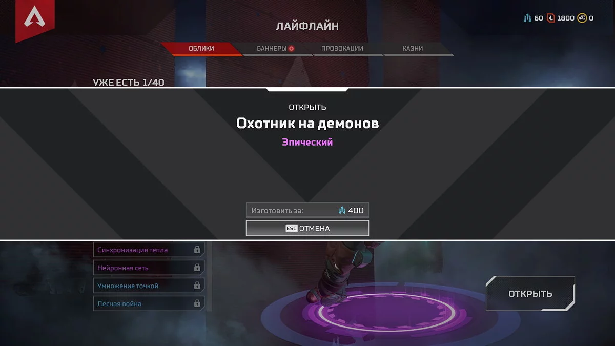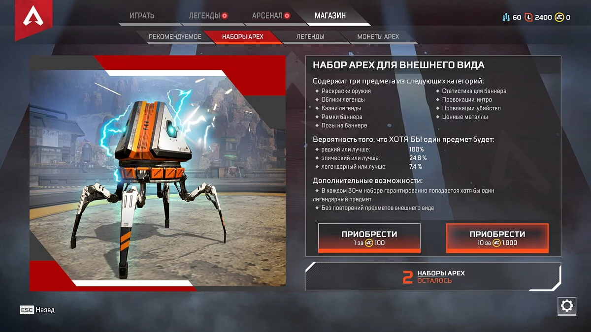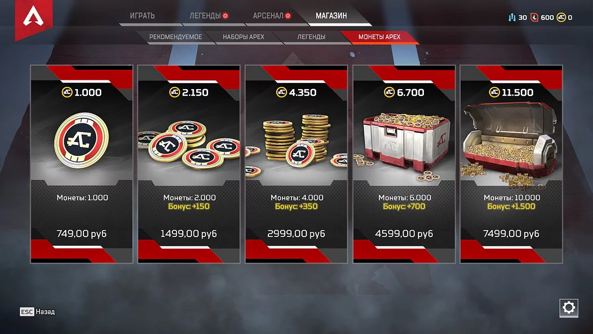- Монеты Apex — покупаются за реальные деньги, расходуются на наборы Apex, покупку персонажей, победных поз и раскрасок.