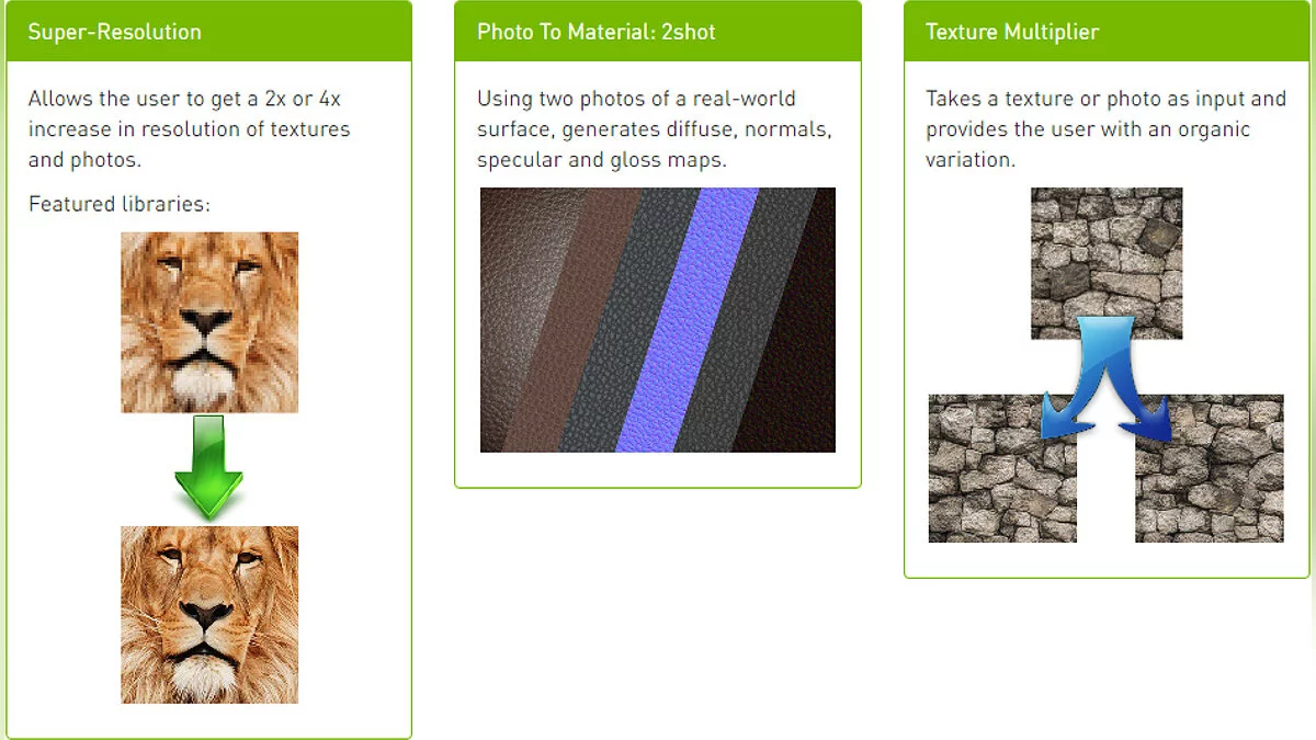 Об интересе к нейросетям уже объявила Nvidia, которая в 2017 году запустила бету своей программы GWMT (GameWorks: Materials & Textures) по совершенствованию графики на основе машинного обучения. Алгоритм утилиты схож с алгоритмами GAN: он увеличивает разрешение текстур и фотографий в 2 и 4 раза, генерирует на основе фото поверхности из реального мира текстуру в игре, берет текстуру или фотографию и выдает ее органическую вариацию.