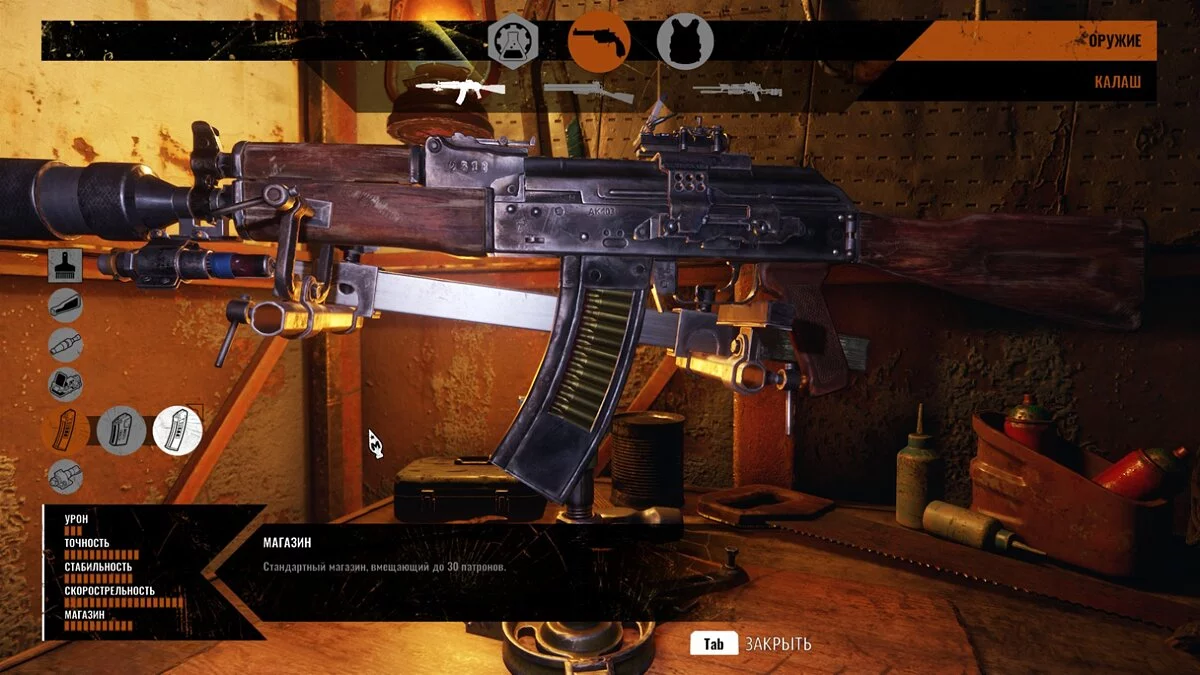 Еще можно улучшать оружие и снаряжение. Для этого нужно разбирать трофейные образцы и исследовать укромные места. Оружие нужно не только модифицировать под текущую ситуацию, но еще и своевременно чистить, чтобы оно работало как следует. А стандартный наруч с часами и дозиметром можно оборудовать металлодетектором и даже датчиком движения.