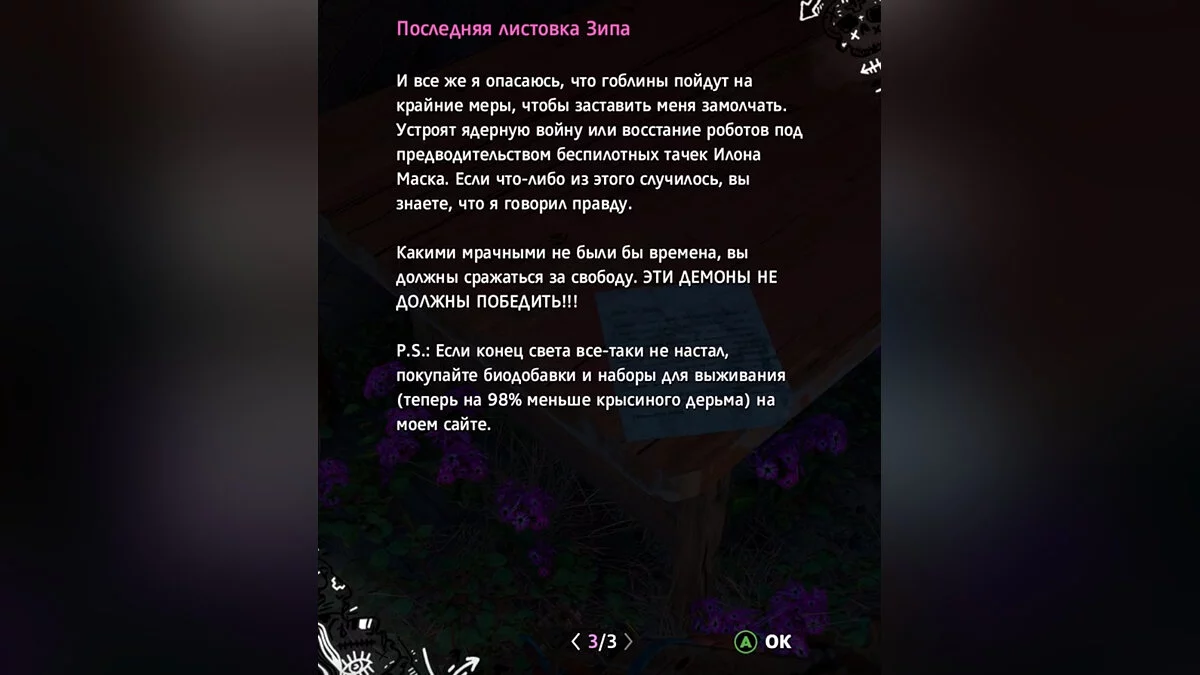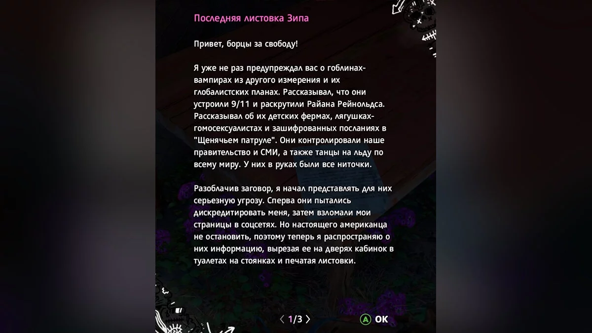 Все, кто проходил Far Cry 5, должны помнить чудака по имени Зип Купка, который постоянно талдычил про мировой заговор. Что ж, в новой игре он оставил послание — записку, в которой рассказывает о гоблинах-вампирах из другого измерения, взявших под свой контроль весь мир.