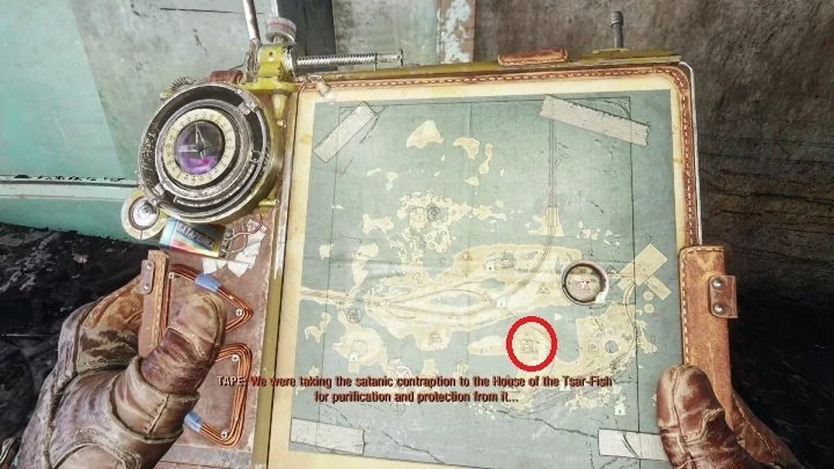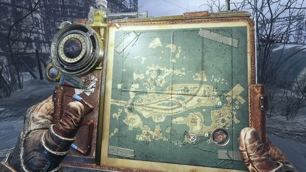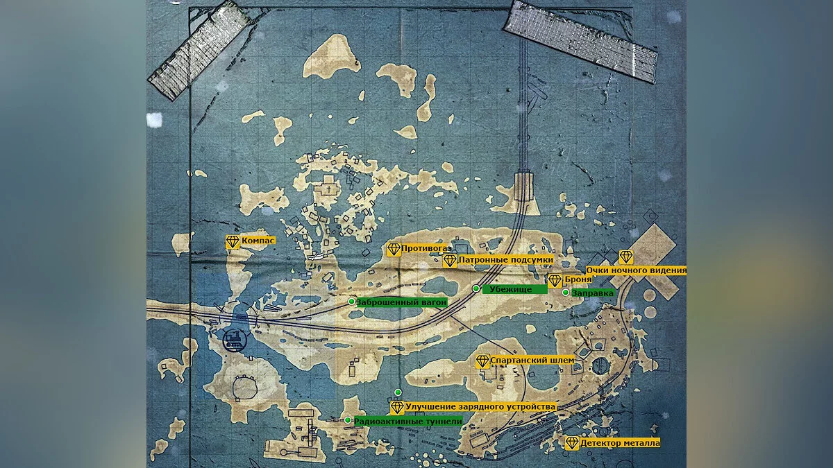 Желтым цветом на карте отмечены улучшения, а зеленым — интересные места. Некоторые из них содержат ресурсы для крафта, другие боеприпасы, третьи скрытые заметки и открытки. Карта показывает скрытые модификации оборудования и оружия, а также некоторые из наиболее интересных мест на Волге.