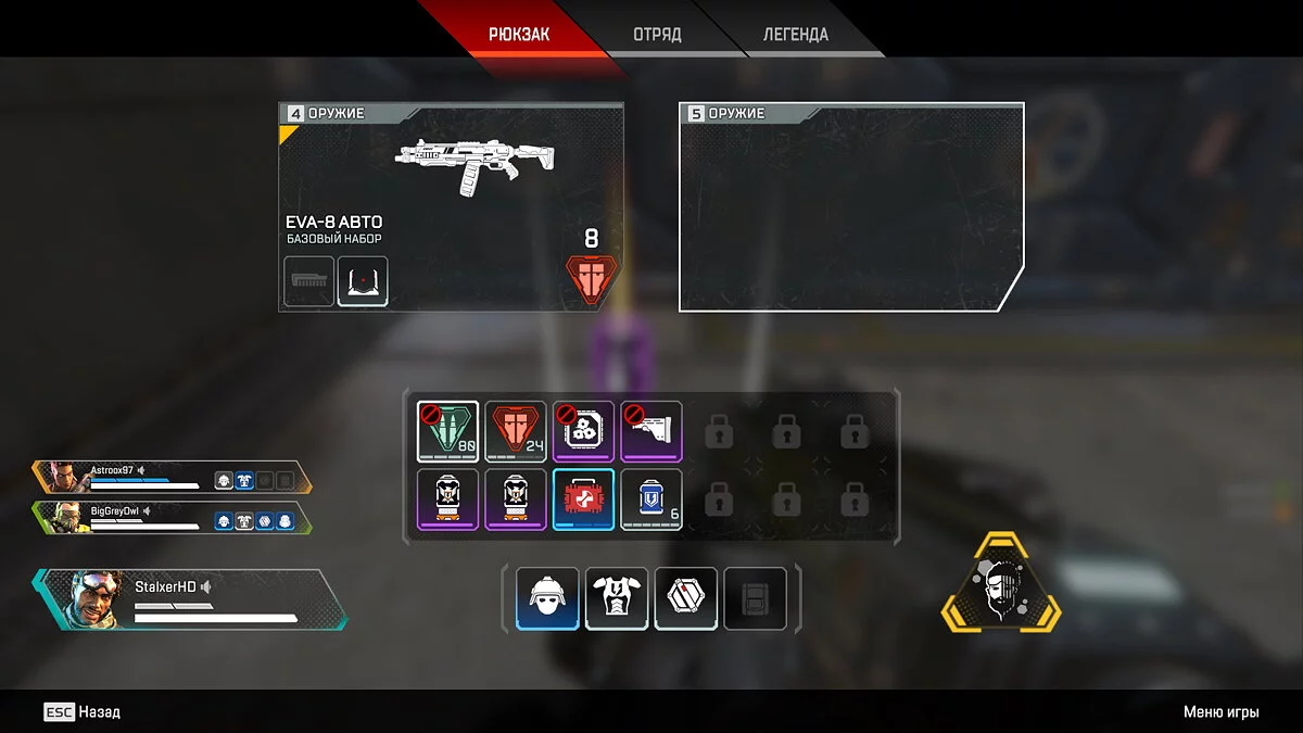 В «королевских битвах» разведка является важнейшей составляющей геймплея. Поэтому авторы таких игр стараются минимизировать интерфейс и инвентарь. Но только не в Apex Legends. Меню инвентаря выглядит не менее громоздко, чем в Fallout 4, за ним ничего не видно: