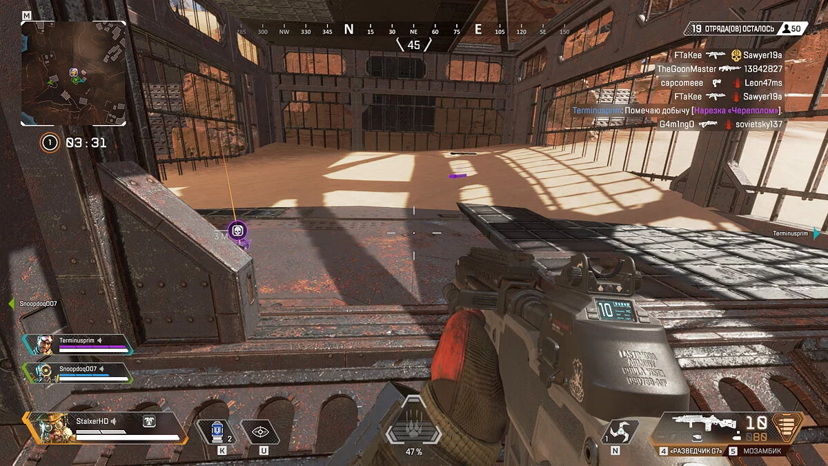Зато способности Бладхаунда и Миража всегда задействованы в бою. Первый пассивно разведывает обстановку, а еще у него есть сканер довольно большого куска местности как тактическое умение. Ультимативное умение Бладхаунда превращает его в «Хищника», готового рвать и метать.