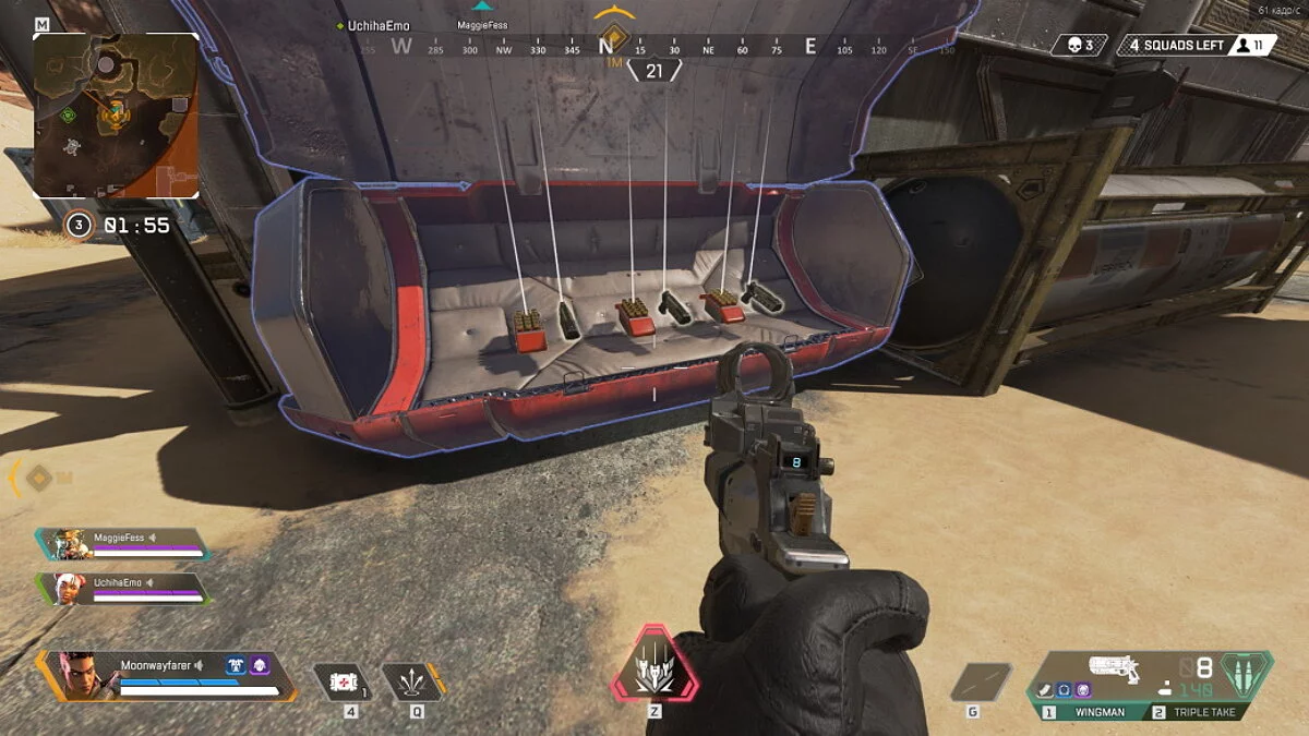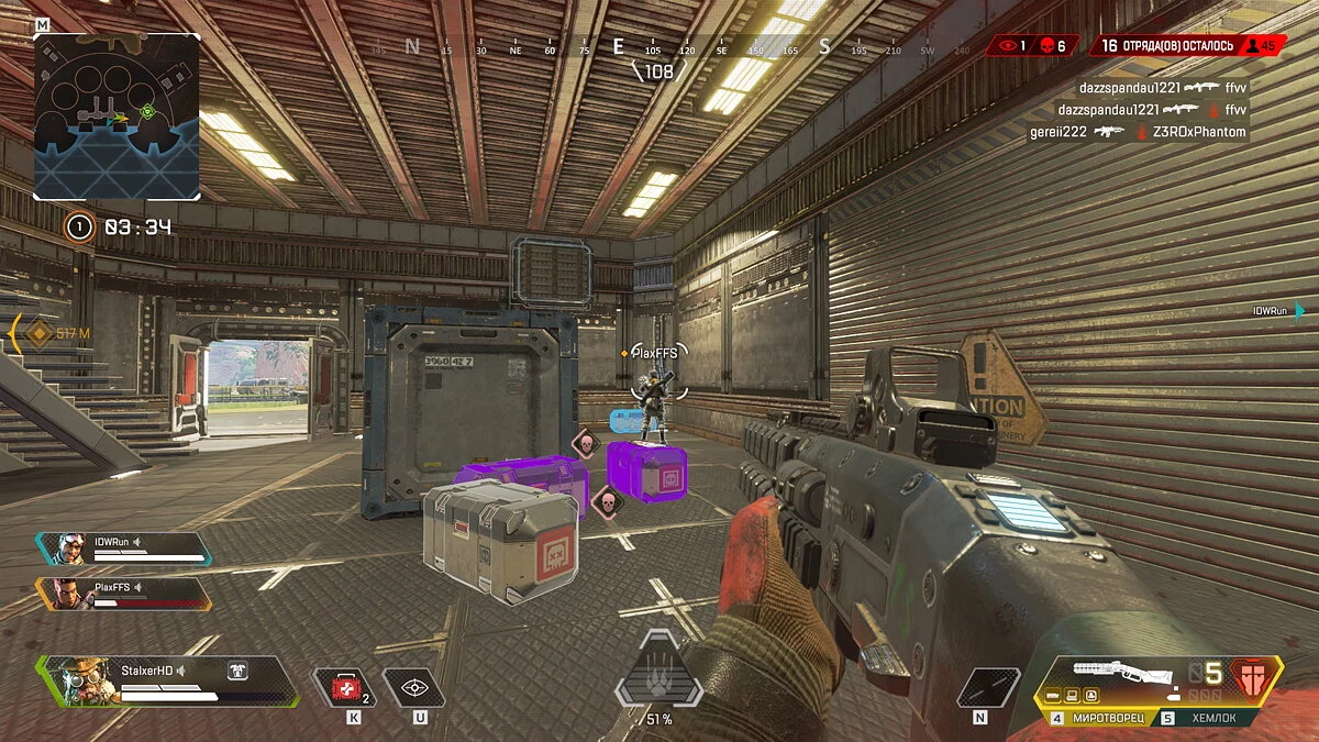Пункт выше — лишь начало злоключений рандома Apex Legends. Мы высаживались в разных зонах, преимущественно фиолетовых, с хорошим шансом выпадения предметов редкого качества (фиолетовых). Более того, мы высаживались в фиолетовых зонах, помеченных синим маркером, по логике заваленных качественным хабаром.