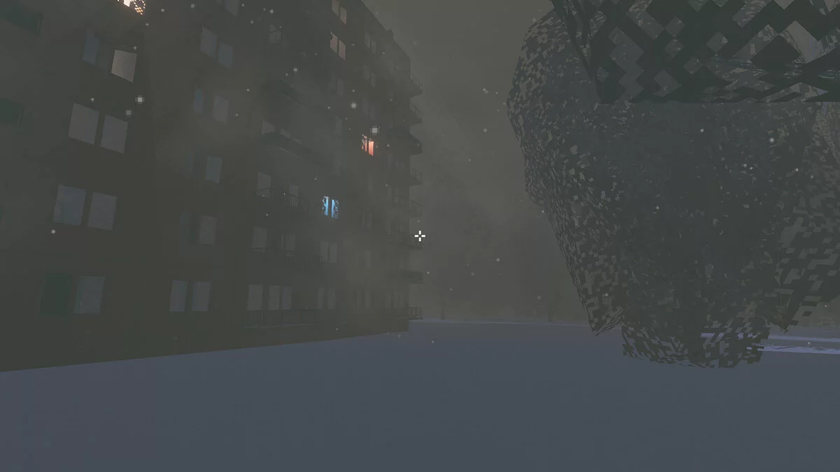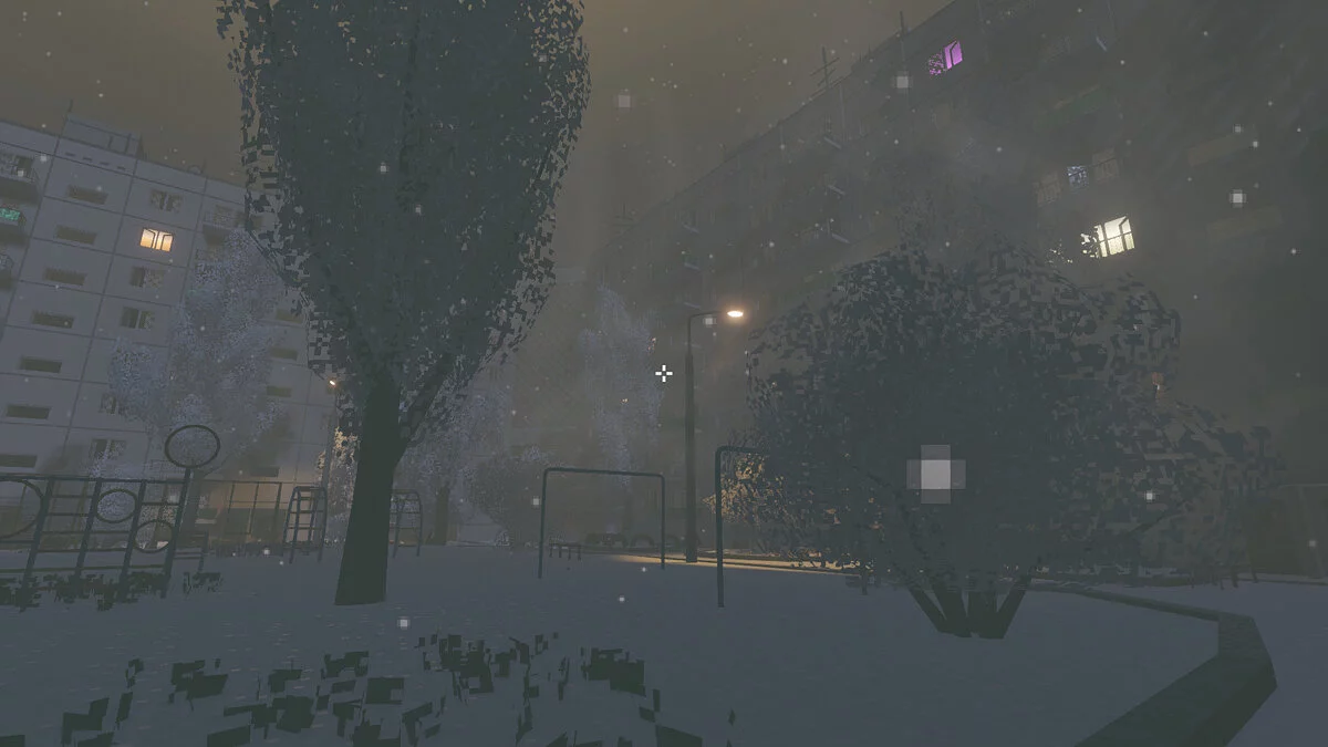 Разбавляют серую картину панельных домов лишь разные магазины, встречающиеся на первых этажах да дорога, разрезающая микрорайон. Мне почему-то вспомнился один мод для Half-Life, где автор предпринял попытку смоделировать свой микрорайон и свой жилой дом. Только там потом началось сражение с хедкрабами и зомби. Здесь не будет хедкрабов. А жаль. Зато в нескольких местах для нас включат стихотворения. Одно из таких мест — возле трактора, который как бы расчищает снег, двигаясь навстречу нам (и толкающему нас, если остановиться сразу перед ним).