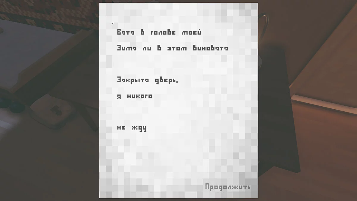 Больше в игре нет ничего. Все действия сводятся к интерактиву с несколькими предметами и прогулке по локации; никакой механики, геймплея, повествования, просто блуждание по уровню с пикселизированной графикой и посредственной оптимизацией, и прослушивание нескладных стихов — для меня лично являющихся графоманией.