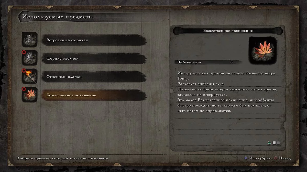 Найдя одно из них, вы можете принести его Резчику в Разрушенный храм, чтобы он прикрепил его к вашей руке. Затем установите его в инвентаре (3 слота) и нажмите кнопку треугольник (PS4) / Y (Xbox One), чтобы переключиться между выбранными инструментами. При использовании этих инструментов потребляются эмблемы душ (Spirit Emblems), которые вы получаете с побежденных врагов. Вы можете увеличить количество эмблем с помощью улучшений навыков. Вы также можете улучшить инструменты у резчика, потратив на это ресурсы.
