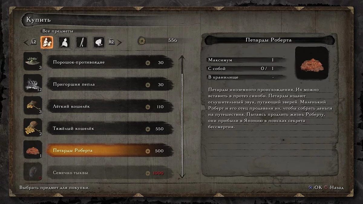 Окраины Асина — Ворота замка Асина. Сразу после предыдущего инструмента вы встретите во дворе первого минибосса, самурая по имени генерал Наомори Каварада (General Naomori Kawarada). Пройдите мимо него и идите по левому пути вниз по склону. Слева от вас будет высокая гора. Используйте свой крюк, чтобы добраться до вершины этой горы. Там вы найдете тайного торговца, сидящего в палатке. Он продаст вам этот инструмент за 500 монет. Вы можете нафармить их, убивая врагов и удерживая квадратную кнопку (PS4) / X-кнопку (Xbox One), чтобы собрать монеты. Если вас обстреляют из пушки, то вы зашли на несколько шагов дальше, гора с торговцем находится перед этим врагом. Резчик превращает Петарду Роберта в инструмент Шиноби Фейерверк (Shinobi Firecrackers).
