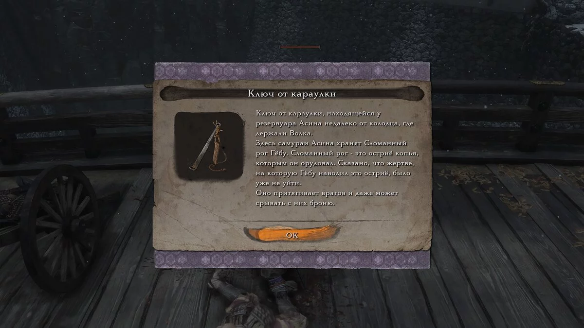 Замок Асина — Замок Асина. От первого идола в этом регионе спрыгните с моста слева и сядьте на ветку дерева. Здесь вы можете подслушать двух врагов, стоящих на мосту. Убейте их, и они уронят Ключ от караулки (Gatehouse Key). С того же моста, на котором вы сражались, спускайтесь по правой стороне, пока не доберетесь до идола Резервуар Асина (Ashina Reservoir). Помните пролог, когда вам говорили, как пробираться сквозь траву? В районе находится множество стрелков и два противника с большими молотами. Откройте дом ключом. Внутри будет большой сундук с сокровищами, который содержит этот инструмент. Резчик превращает Сломанный рог Гебу в инструмент Заряженного Копья (Loaded Spear).