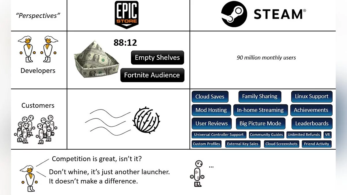 Из-за этого возникают ситуации, когда игра была заявлена к выходу в Steam наряду с другими платформами, но в последний момент планы разработчиков изменились. И вот уже их игра является эксклюзивом EGS. Во всем мире такие методы конкуренции называются нерыночными и считаются агрессивными по отношению к конечному потребителю.
