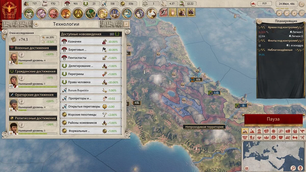 Панель технологий предлагает купить за гражданские очки те или иные нововведения в четырех категориях: армия, общество, дипломатия и религия. Технологии влияют на все аспекты игры, так что ими явно не стоит пренебрегать.