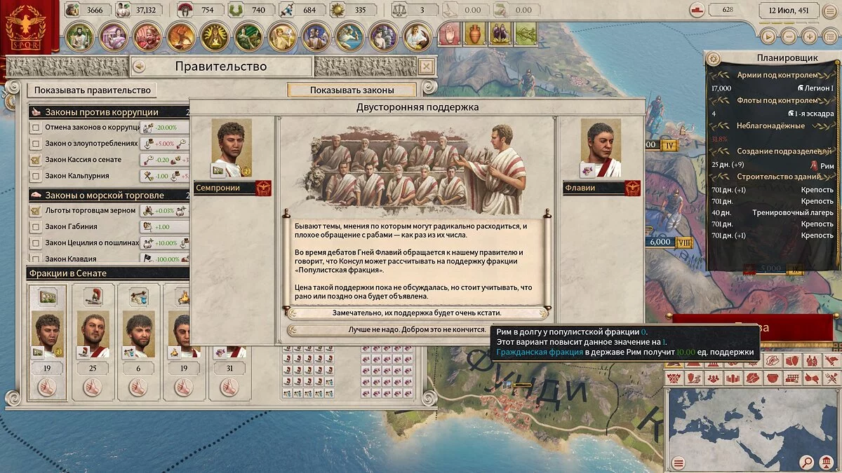 Поскольку в вашем государстве множество элитных семей, они образуют группы по интересам и заседают в Сенате (у римлян). Борьба за власть между ними идет постоянно и вам придется в ней участвовать, чтобы извлечь те или иные преимущества. Так, военная фракция даст бонусы вашей армии, а гражданская — к налогам, времени и скорости строительства.