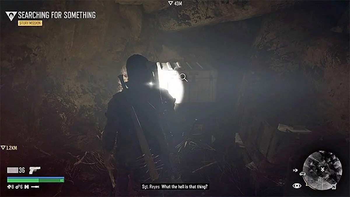 Включите фонарик и внимательно осмотрите пещеру. Вы должны найти небольшой лагерь и белый ящик с инъектором.