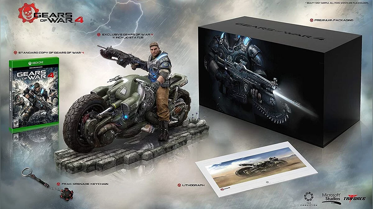 Интересное коллекционное издание Gears of War 4 не может похвастаться целой кипой мелочей, но здесь все по делу. В набор входит невероятная фигурка героя с огромной пушкой, который гордо восседает на крутом мотоцикле. Также в издании есть небольшой брелок, литография и, конечно, копия игры.