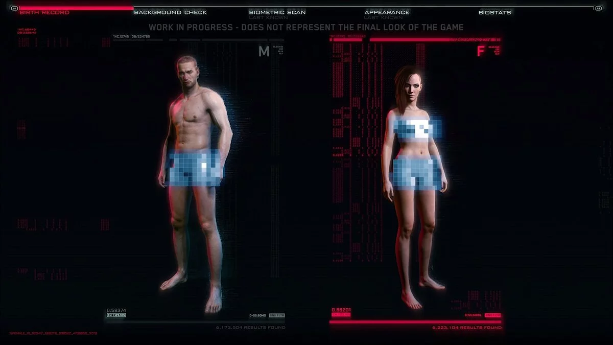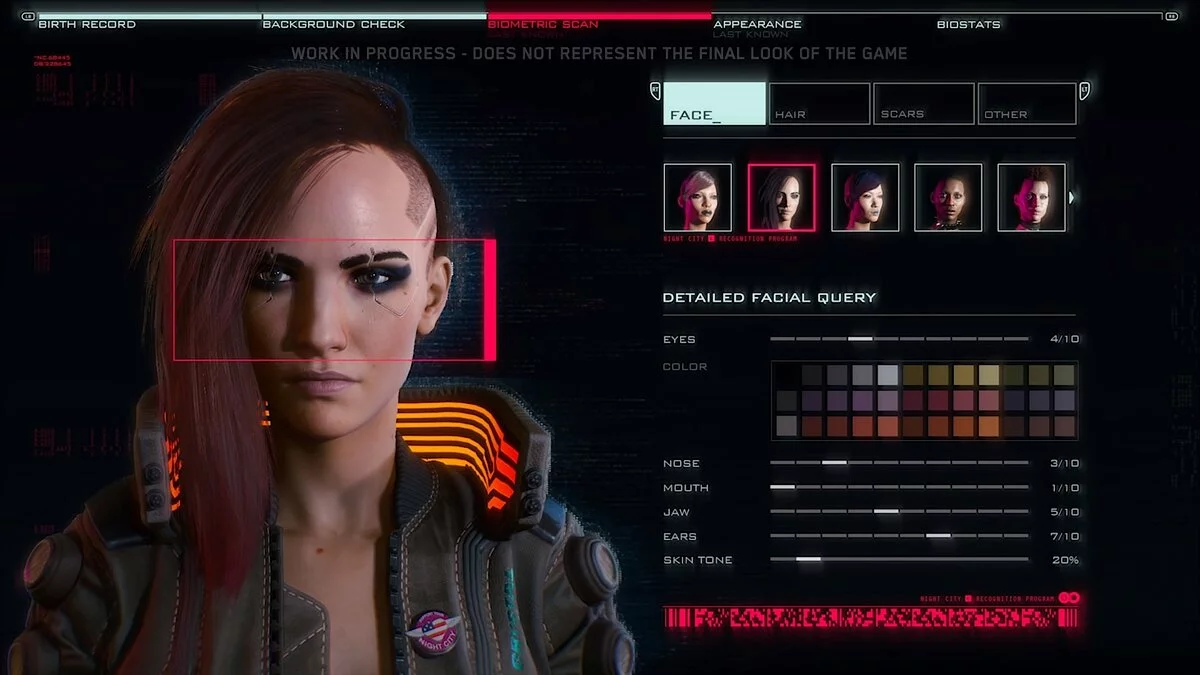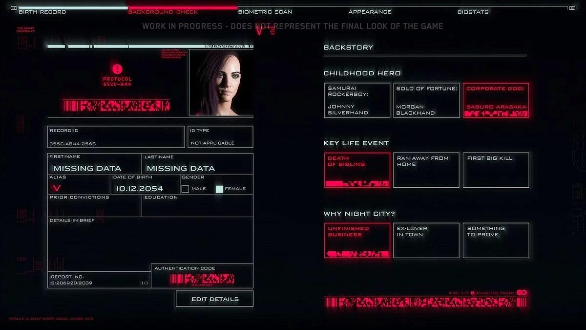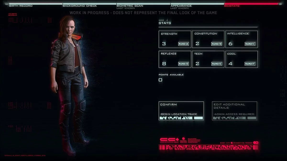 В отличии от серии игр про Ведьмака, где персонаж уже был заранее создан, в Cyberpunk 2077 можно будет создать своего собственного героя благодаря глубокой системе кастомизации. Всего на выбор будет доступно пять вкладов: Свидетельство о рождении, Проверка данных о происхождении, Биометрическое сканирование, Внешность и Атрибуты.