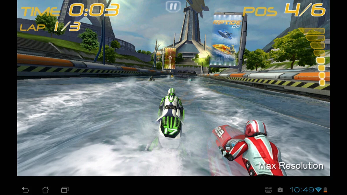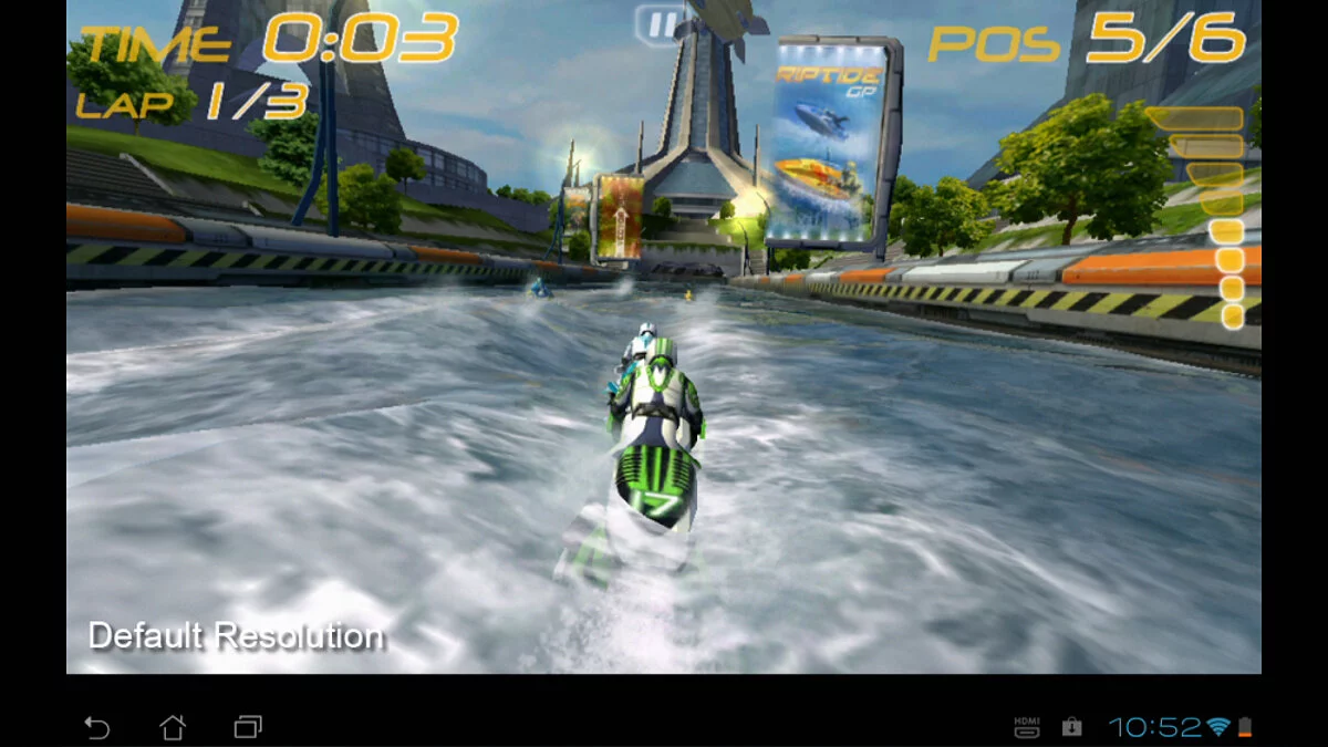 Riptide GP также прекрасно показывает себя на новой платформе. Графика в игре поддерживает реалистичную прорисовку воды и расчет физики, а что особенно впечатляет, так это то, что действия игрока адекватно влияют на модель обработки окружающего мира. NVIDIA Tegra 3 отлично обрабатывает и другие эффекты, вроде брызг воды, зеркального отражения, а FPS редко падает ниже 60.