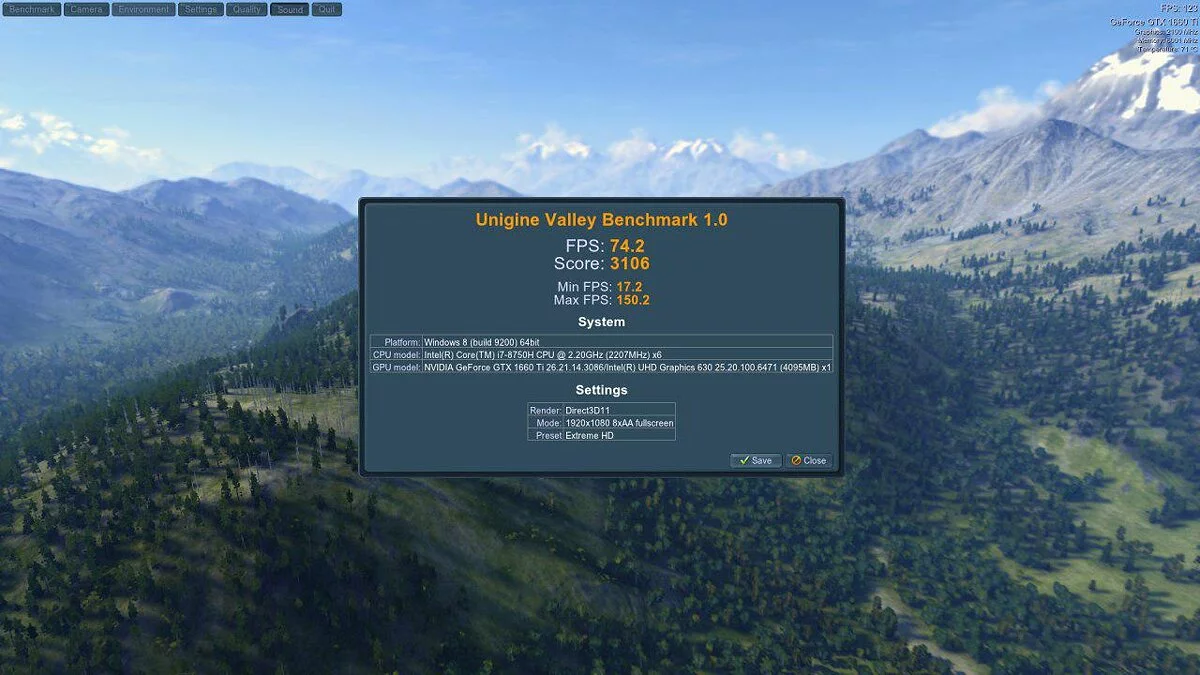 GL73 8SDK показывает неплохой результат, обгоняя многие игровые ноутбуки. Новая графика от Nvidia обеспечивает отрыв в 44% в Fire Strike Extreme и 51% в Time Spy. В Unigine Valley ноутбук выдает 74 кадра в секунду. А вот Superposition Benchmark оказался тяжелым испытанием.