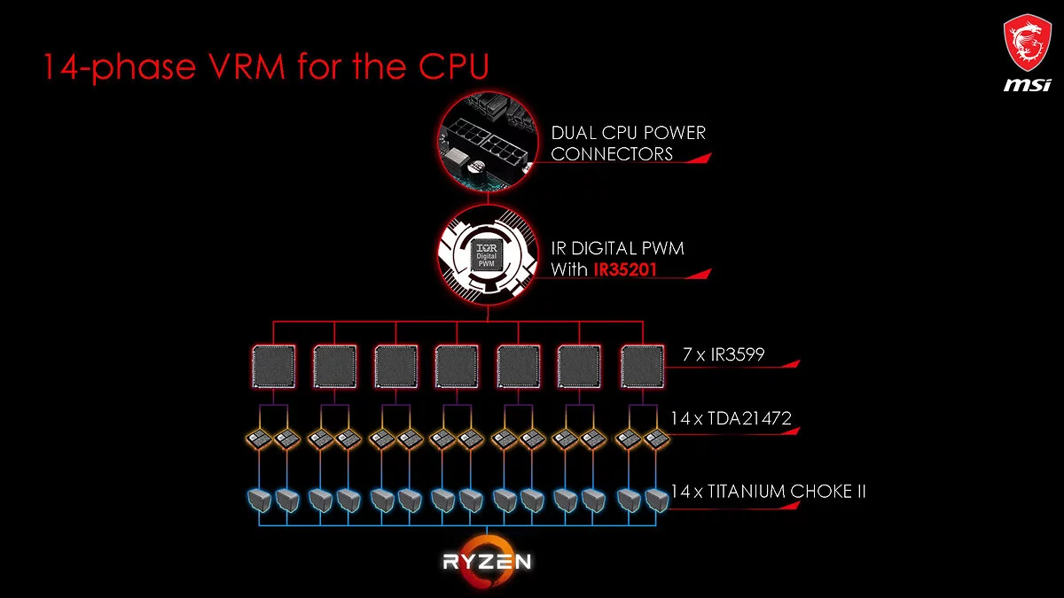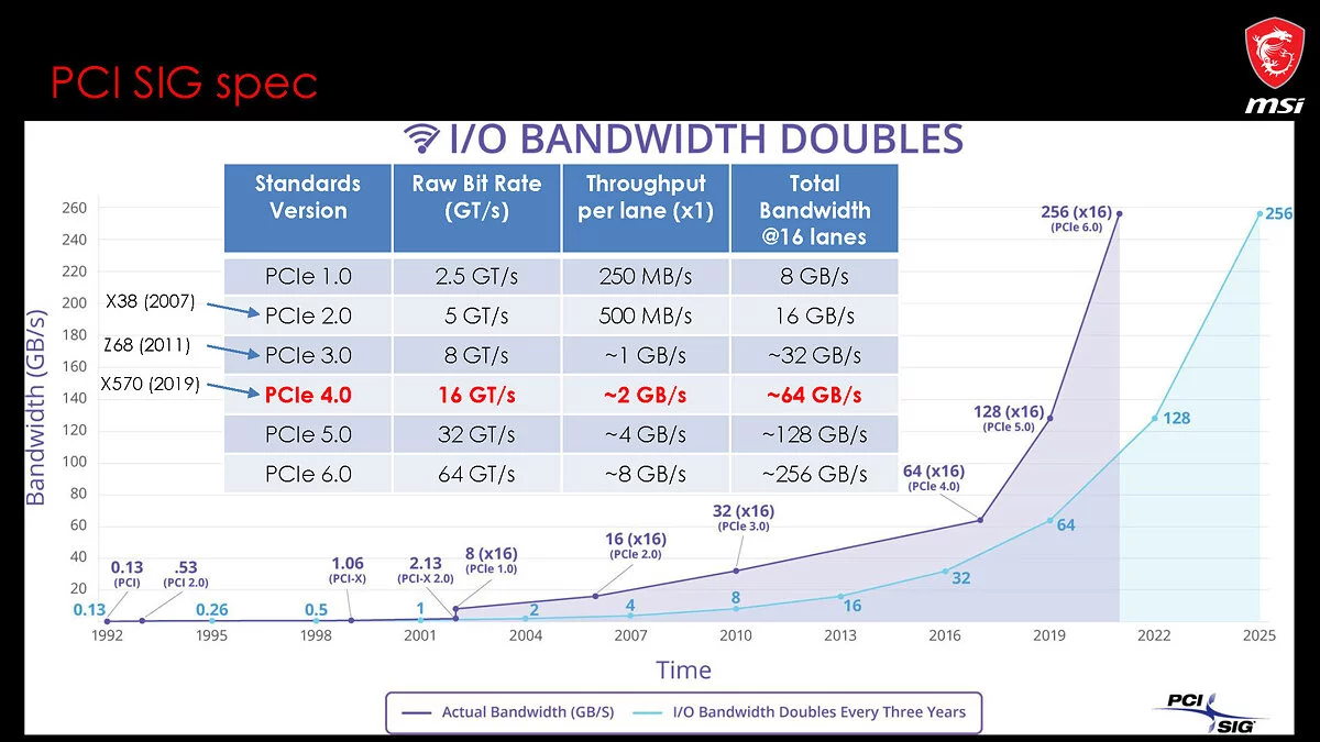 Материнские платы MSI с чипсетом X570, которые поддерживают новые процессоры AMD Ryzen серии 3000, выделяются стандартом PCI Express 4.0, а также измененной системой питания. Новый интерфейс приходит на смену PCIe 3.0, появившемуся еще в 2011 году. Главными плюсами этой технологии являются повышенная пропускная способность. К примеру, в сравнении с PCIe 3.0 новая шина (PCI Express 4.0) предлагает 64 ГБ/с на 16-ти линиях.